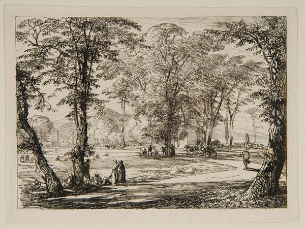 Editor: Here we see "In the Bookham Lane, Surrey" by James Duffield Harding. The sepia wash gives it a slightly nostalgic air. What visual elements stand out to you? Curator: Note the deliberate use of chiaroscuro, the strong contrast between light and shadow, to create depth and spatial recession. Harding masterfully employs this technique. Do you see how the dense, layered foliage on the left gradually gives way to a lighter, more open space on the right, guiding the eye along the lane? Editor: Yes, I see it! It's like the trees are a curtain being pulled back. Curator: Precisely. The composition, in its structural arrangement, invites contemplation of light itself as a shaping force. Editor: It’s interesting to consider light as a structural element, not just illumination. Curator: Indeed. Focusing on the formal elements reveals an impressive artistic control.
