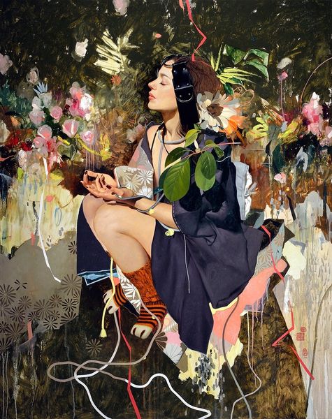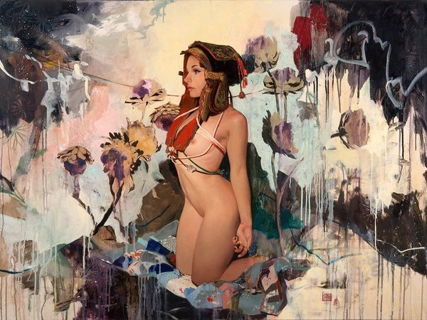 Editor: This is "The Evening Primrose" by Soey Milk. The artist uses a mixed-media approach to capture a female nude. The color palette creates an ethereal quality, but the model’s eyes evoke melancholy. How do you interpret this work? Curator: I’m struck by how the painting operates through a layering of visual symbols. The evening primrose itself is a flower often associated with feminine mysteries, cycles, and resilience. How might that relate to the figure, who is both vulnerable and self-possessed in her gaze? The shawl is another symbolic layer. Does it conceal or reveal? Think about its color – olive drab is also linked to the military. Is there something about feminine identity as both soft, powerful and connected to broader societal forces? Editor: I didn't even think about the name "Evening Primrose". That’s really fascinating considering its usual context, so how can something delicate tie into the strength implied by military symbology? Curator: Exactly. That position suggests conflict, perhaps. Think of it not just as brute strength, but resilience. How does a woman navigate societal expectations, vulnerabilities, and the cultural memory inherited through generations? What do her surroundings of plants and the unmade bed suggest? Editor: That interplay creates such depth! I had originally only focused on the more superficial aspects of it, but the layering of cultural memory really makes the painting come alive. Curator: Indeed, Soey Milk gives us space to unpack the visual grammar, making meaning as we weave these layers together. It suggests an opportunity to reconsider ingrained notions that surround the female figure in art.