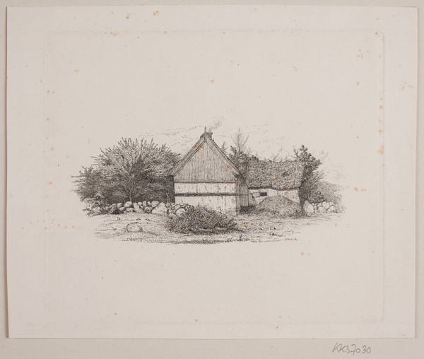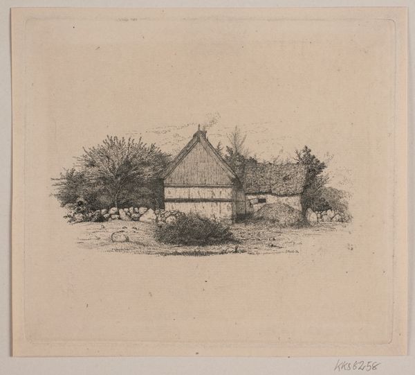 This is Vilhelm Kyhn’s "Et bondehus," a small print now held at the Statens Museum for Kunst. Kyhn masterfully employs etching to create a composition of detailed textures and subtle tonal contrasts, drawing the eye into the serene depiction of a rural scene. The structure of the artwork emphasizes a harmony between architecture and nature. The thatched roof of the farmhouse and the rugged stone wall create a textured rhythm. A semiotic reading reveals the farmhouse as a signifier of stability and the natural elements pointing to Denmark’s landscape and cultural identity. Kyhn's attention to the materiality of the scene invites us to consider the relationship between form and content. The textured details are not merely descriptive but evocative, offering a deeper engagement with the values of simplicity and authenticity. These formal decisions root the work in a visual and cultural dialogue about the essence of Danish identity.
