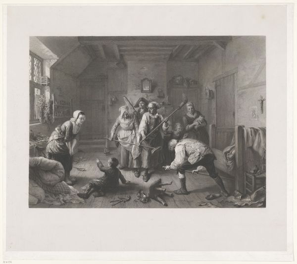 Abraham Raimbach created this print, "Blindemannetje in interieur met openhaard," using etching techniques. The image's detailed composition immediately conveys the chaos and energy of a children's game of blind man's buff. Note how the artist uses light and shadow to create depth and to focus our attention on the frenetic activity at the center. The architectural structure of the interior, with its receding walls and exposed beams, creates a stage for the unfolding drama. Raimbach masterfully uses line and form to capture the poses of the figures: the blindfolded player reaching out, the children scrambling away, and the onlookers positioned along the periphery. The print engages with broader cultural themes about childhood, domesticity, and social interaction. By inviting us to observe this playful scene, Raimbach prompts us to consider the roles and dynamics within a community, capturing a moment of shared experience and delight, that leaves us reflecting on the social rituals we create.