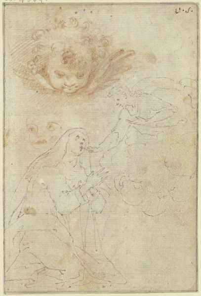 Curator: Looking at this intriguing chalk drawing, titled "Ascension of the Magdalene," attributed to an anonymous artist of the Renaissance, one is immediately struck by the ethereal quality achieved with simple materials. Editor: Yes, the rawness of the red chalk on paper emphasizes that spiritual frenzy. Magdalene, surrounded by angels, seems pulled upward not just physically but emotionally. There’s a vulnerability in their open mouths. Curator: Exactly. Note the layering of strokes, creating a sense of depth and movement. Chalk, in this context, was easily accessible, facilitating preparatory sketches and studies. Its impermanence lends a sketch-like character here, perfect for capturing transient, spiritual experiences. This drawing, however, feels complete, which underscores an appreciation for accessible artistic materials and the value given to such studies in the period. Editor: And the symbolic weight! Angels pulling Magdalene heavenward speak to ideas of repentance, divine forgiveness, and ultimately, transformation. The image plays on centuries of artistic interpretations of the Magdalene as the redeemed sinner. See how the artist utilizes her gaze? Eyes are lifted; her posture yields. It powerfully renders an ascent beyond earthly struggles towards the promise of grace. Curator: Interesting how a readily available material—red chalk—can become a conduit for something so profoundly evocative. It almost undermines a sort of “art world” preciousness and shifts focus to devotional art. Editor: Quite right. The material simplicity underscores the transformative journey, accessible to any viewer regardless of status or material possessions. Artistically, consider its enduring narrative. It is powerful imagery, linking the viewer to core tenants of repentance, redemption and transformation. Curator: This reminds us of art's unique capability to blend everyday physical material into profound and impactful artistic and religious expressions. Editor: And to provide new meaning into canonical and long standing symbols. Magdalene and angels continue to fascinate through their complex iconography, a blend of religious doctrine and emotional nuance.