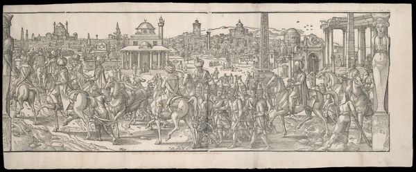 Editor: Here we have "Scena Di Trionfo All'antica" by Lo Scheggia, made with tempera and oil paint. It looks like a historical parade scene with classical architectural elements. The figures seem quite stiff and linear, and there is a lot of detail in the costumes and buildings. What elements of its formal composition stand out to you? Curator: Consider the arrangement of forms: the composition displays a clear division between foreground and background. Note how the figures are organized in a frieze-like manner. Observe the artist’s utilization of line. Is it not remarkable how linear precision defines form, often superseding concerns with naturalistic representation? Do you notice how line dictates form? Editor: Yes, the outlines are very sharp, making everything look quite flat, almost like a tapestry. Also, the perspective is... interesting. The buildings in the background seem almost stacked on top of each other. Curator: Precisely. We find, rather than adherence to mathematical perspective, a concern with decorative arrangement. The architectonic structures function less as believable space and more as a patterned backdrop, thereby framing the figures. Note, too, the employment of colour. How would you define the palette deployed? Editor: I see mainly earth tones – reds, browns, whites, with hints of green and gold to bring a little flourish. Curator: Precisely, the earthy tones, further emphasize a tactile quality of the work, focusing us away from representation and towards surface, towards medium, towards form itself. Editor: So, the flatness and slightly unrealistic perspective weren’t mistakes, but rather choices emphasizing the painting's formal qualities? Curator: Indeed. The painting’s visual language speaks not of spatial illusion, but rather an autonomous deployment of formal means. Editor: That's a really interesting way to see it. I hadn’t considered how those “choices” might actually contribute to the piece as a whole, focusing on the material itself, more than just the image portrayed. Curator: Absolutely. By analyzing these formal relationships, we uncover the true depth of the artwork.
