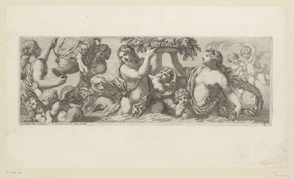 Editor: This engraving from 1536, "Six Warriors with Ornate Helmets," is by Giovanni Battista Scultori. The detail is incredible, and it evokes a real sense of classical heroism. How do you interpret this work? Curator: It’s interesting how Scultori uses these figures to recall Roman ideals. Notice the helmets—each uniquely adorned, almost like personalized heraldry. What symbols do they evoke for you? These aren’t just warriors; they’re bearers of something. Editor: They feel like individual representations of valor and authority, and are the ornate helmets markers of their individual status? Curator: Precisely! Each helmet functions almost as a mask, amplifying individual identities while contributing to the collective power. Think of the Renaissance fascination with antiquity. Aren't these helmets echoes of those ancient gods and heroes? They are laden with meaning far beyond mere protection. Consider the role of cultural memory here: does the piece evoke certain feelings for you, now that you recognise these ancient themes? Editor: Definitely. The figures seem to represent the weight of history, reminding us of past leaders and events. They seem almost trapped in a distant past. Curator: Exactly, an artistic freeze, where cultural symbols of heroism, lineage and legacy blend together to create a single meaning. We are witnessing not just a group of fighters but symbols of legacy. Editor: It’s amazing how much the artist conveys through these symbols and figures. I see them differently now, it's as if I understood the Roman heroes for the first time. Curator: Indeed. The engraving offers layers of insight into Renaissance perceptions of power and heritage, communicated through an enduring visual language.