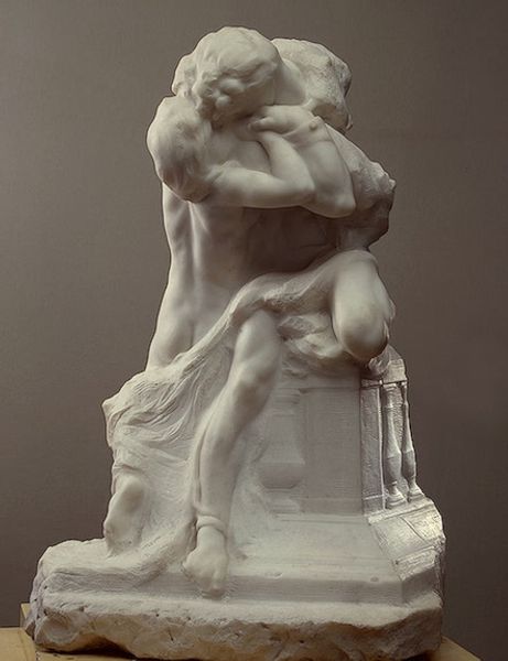 Curator: Auguste Rodin's marble sculpture, "The Kiss," created in 1904, presents an entwined couple in a moment of intimate embrace. Its sensuality is immediate. Editor: Indeed. I’m immediately struck by the vulnerable and complicated narrative implicit in its public display; consider the loaded gaze of an audience encountering the nudity of these subjects while perhaps understanding the mythic and historic context that underpins Rodin's approach. Curator: Focus on the visual here. Consider the masterful treatment of marble, Rodin's skill in rendering skin texture, the contrast between the smoothness of the figures and the rough-hewn base—a device highlighting their idealized forms. What’s your read of this use of contrasting elements? Editor: While I acknowledge the skill involved, my interests lie beyond surface aesthetics. The source narrative interests me far more. Originally conceived as part of "The Gates of Hell," the lovers depicted are Paolo and Francesca, figures from Dante's Inferno, punished for their adulterous affair, a detail we might easily overlook in the sweeping romanticism. In what ways, for example, does this narrative shape how we perceive the lovers' bodies, both aesthetically and politically? Curator: The narrative, of course, exists, but the sculpture transcends mere illustration. It embodies universal themes of love and passion. It seems that you don't see it this way? What is more, observe how Rodin uses asymmetry in their embrace and dynamic torsion in their limbs to energize the form. It is not passive, but dynamic, passionate...alive! Editor: But what does such universalism truly serve if we ignore the specific sociopolitical circumstances giving birth to it? And does that universalism ultimately reinforce exclusionary or patriarchal social constructs? After all, whose love stories, which bodies, are granted this level of public commemoration and artistic representation? These questions are important to ask in order to challenge hegemonic narratives and dominant representational paradigms. Curator: And what a world it would be without great representation of love between bodies, with this piece’s celebration of skill and, yes, beauty! Editor: To be sure. Though it is in precisely its beauty and skill that this sculpture warrants contemporary analysis beyond the simple viewing pleasure. Let us strive to have many points of entry that expand rather than contain interpretations.