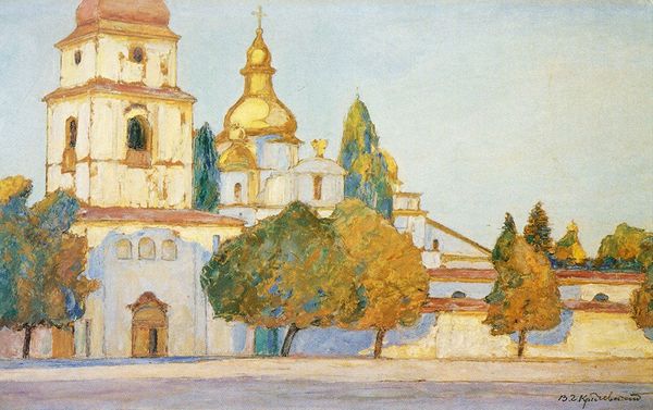 Editor: This painting, "Saint Tshaveli. Mtskheta," created in 1927 by Pyotr Konchalovsky, presents an architectural landscape in oil paint. I am intrigued by how tangible the stone texture of the building appears, and also struck by how it makes me consider the architectural craft. What draws your attention when you view this piece? Curator: From a materialist perspective, what jumps out is the active relationship between Konchalovsky's chosen medium, oil paint, and the subject, architecture. Note how he’s applied the paint, mimicking the rough-hewn texture of stone, almost enacting the physical labor involved in building the church itself. The visible brushstrokes point towards the means of production of the painting – labor! – but also invite the viewer to imagine the construction of the church. What does that connection mean to you? Editor: It's fascinating! It wasn't something I immediately considered, but you're right, the brushstrokes suggest a parallel between painting and building. It suggests both are material processes, involving labor. Does the somewhat muted color palette influence that reading? Curator: Absolutely. The limited palette and earth tones emphasize the raw materials, bringing attention to the very matter from which both the painting and the church are constituted. Also consider the social context; Russia in 1927, after the revolution, saw shifts in art production toward celebrating the worker. Could Konchalovsky's focus on the materiality relate to this broader trend? Editor: That's a very compelling point. I can now see the connection between the artwork's material qualities and its potential social commentary, adding a completely new layer to my understanding. Thank you. Curator: Indeed. It makes me think more about the relationship between art, labor, and the celebration of materiality.