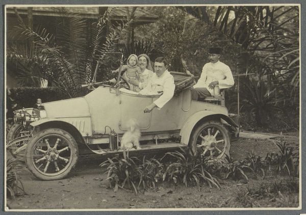 Curator: Let’s discuss this silver gelatin print titled “Twee Ford auto's met de eigenaars Hasan en Mohamed en hun knecht”, possibly created between 1925 and 1926 by A.G.A. van Eelde. The direct translation would be: “Two Ford cars with the owners Hasan and Mohamed and their servant.” My initial reaction is a sense of stark stillness. Editor: Yes, that stillness really strikes me too, there’s a strange quality, almost melancholic in the composition. The figures seem self-conscious in relation to the camera, particularly that visible social hierarchy represented so bluntly in the car’s presence and its relationship to each figure. It begs many questions. Curator: Absolutely. What we're looking at is not just a photograph but a social document. It reflects the changing social dynamics of the period and class distinctions embedded within colonial structures, where motor vehicles could be seen as potent signifiers of wealth and modernity. We can see that in their clothes as well as their relation to each other and their relative distance from the cars themselves. Editor: Right. It highlights the complex relationship between these individuals, perhaps suggesting class dynamics inherent in these kinds of travel adventures at the time. You can sense their awareness of being portrayed. Do you think van Eelde, as the photographer, was explicitly engaging with colonial discourse or simply documenting what he saw? Curator: It's likely both, or more complex, perhaps, than either of those alone. The very act of photographing these individuals and labeling them within this colonial-era description implies a certain framing. I find myself wondering, who was this image meant for? Was it intended for circulation back in Europe? Editor: Good questions. The work, while technically a "genre-painting," as tagged in the metadata, functions more as a complex interplay of identity, power, and representation. The way the individuals present themselves hints at those broader social constructs and cultural expectations. Curator: And what of these "modern" vehicles and their role within a postcolonial discussion. These cars open up distances that would have seemed vast and unknown to most. A sense of adventure maybe, a way of penetrating even further inland, both figuratively and physically. They speak to aspirations and a complex dance of identities being renegotiated within that historical moment. Editor: Ultimately, looking at van Eelde’s silver gelatin print gives you so much more to consider in those formative, turbulent moments for colonized states, especially in how photography itself contributed to, and captured those realities, one carefully posed portrait at a time. Curator: Agreed, and thinking about the era itself is a good reminder of the changing dynamic during that interwar period in Dutch colonial territories. A single image holding an entire network of social history.