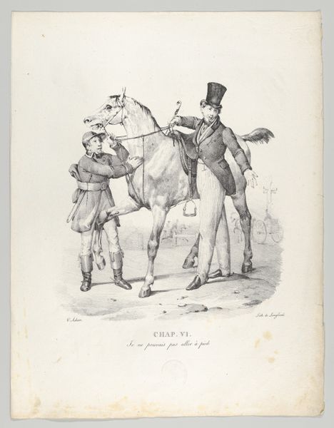Honoré Daumier made ‘Progrès de l'équitation’ using lithography, a printmaking process that democratized image production in the 19th century. Daumier drew directly onto a stone slab with a greasy crayon, which was then chemically treated to accept ink only where the drawing existed. The grainy texture and subtle tonal variations we see here are characteristic of lithography. It allowed for relatively quick reproduction, ideal for satirical prints commenting on contemporary society. This print would have been produced in large numbers and circulated widely. Daumier’s choice of lithography, a medium accessible to a broad audience, underscores his commitment to social critique. The print’s biting humor, targeting the pretensions of the upper class, is amplified by the very process that allowed it to reach the masses. It’s a reminder that artistic choices about materials and methods can be deeply intertwined with issues of labor, politics, and consumption.