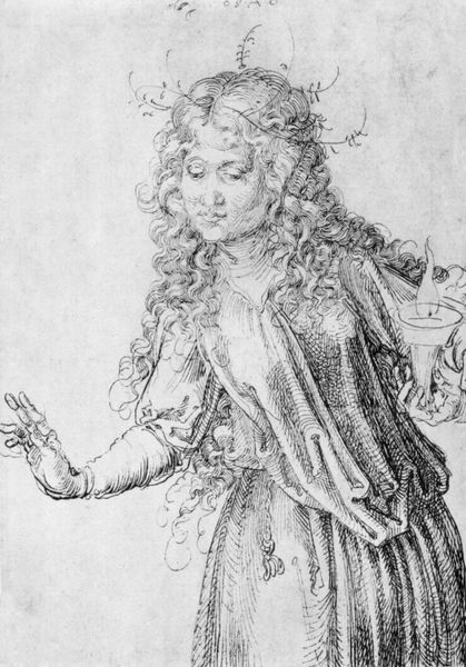 Curator: Welcome. We are looking at a pen and ink drawing by Albrecht Durer, entitled "St. Agnes". Editor: I am struck by the ethereality, despite the weight of the linework. The sketch has a fragile yet potent quality, particularly with that curious figure hovering over her shoulder. Curator: This image invites exploration through a feminist lens, really questioning the role of female saints. Agnes was martyred for her faith; what power dynamics do you see at play? She looks both regal and melancholic. The lamb is her typical attribute, so she is both herself, but in a strange way also an early depiction of someone being victimized by religious dogma. Editor: The line quality definitely supports the dichotomy. See how Durer uses incredibly fine hatching to model the lamb’s wool, and in contrast, a thicker, bolder stroke for her gown. And note the careful distribution of light and dark to convey depth, pulling focus to St. Agnes, but also toward that floating… apparition. Curator: I read the "apparition" as a symbol of patriarchal constraint—a heavenly body almost dictating her fate. Look at her downcast eyes; it conveys a lack of agency but with the look of a budding agency that has been shut down too soon in her young life. Agnes rejected marriage, which then resulted in her execution for rejecting marriage, but that defiant act in itself should read as rebellion against the status quo. Editor: That juxtaposition, visible right there in Durer’s technical rendering of tone, offers a strong narrative. What really holds my attention is Durer's signature 'AD' monogram, almost casually placed at the bottom. Even that is presented with equal care as he did Agnes’ dress. Curator: Thinking about intersectionality, Durer captures both class and gender roles of that time. What is deemed holy versus what is a political act—sometimes the lines aren't as clear as we like to think they are. Editor: Yes, that intersection makes his use of the pen's tonal range to denote a powerful ambivalence rather remarkable, even timeless. Thank you for pointing this all out. Curator: Thank you for teasing out Durer’s line work—there is much complexity present with just pen and ink, and by extension, a world of possibilities in how we consider artwork, then and now.