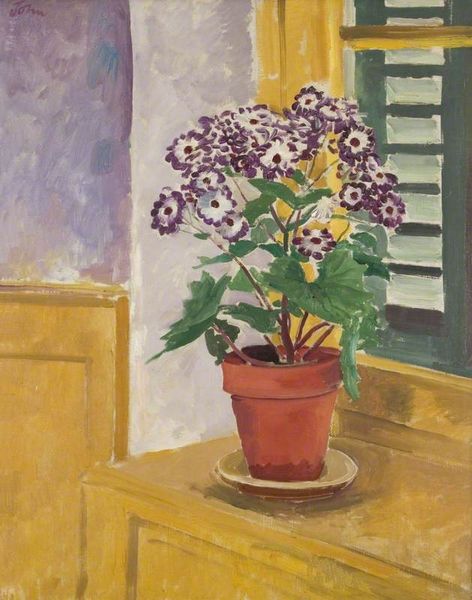Editor: Here we have Pyotr Konchalovsky’s 1952 painting, "Still Life. Lilacs in a glass jar against the stove,” rendered in oil paint. The overall impression is one of serene domesticity. The colours are very muted and naturalistic. What strikes you about it? Curator: What captivates me here is the artist's deployment of impasto to create texture. Notice how Konchalovsky doesn’t just represent lilacs; he builds them on the canvas, echoing their profusion in nature. Observe too, the subtle orchestration of colour. What at first appears to be a limited palette is, upon closer inspection, a complex interplay of lavenders, greens, and earth tones. How does this restricted range inform your understanding? Editor: I guess I see how it focuses the attention, especially how the white background enhances the tonal variation in the lilacs. But I'm not quite sure about the…flattened space. Is that intentional, do you think? Curator: Indeed! This flatness disrupts conventional perspective, forcing us to acknowledge the picture plane itself. Consider the tiles behind the lilacs. Do they recede realistically into the distance? No. They are rendered with a similar degree of emphasis as the floral arrangement, collapsing foreground and background. This emphasis on the two-dimensional surface aligns the work with certain Post-Impressionist strategies. Editor: I never considered the flattening effect before, that’s a great perspective! I had been thinking of it simply as a still life painting, but I understand it in a completely different way now. Curator: It is a demonstration of the fact that careful analysis reveals layers of complexity and challenges our initial assumptions. The artist's considered formal decisions affect profoundly our comprehension of art. Editor: Absolutely. Seeing the art as constructed out of visual components helps appreciate its value as art, not only as pretty or emotionally appealing.