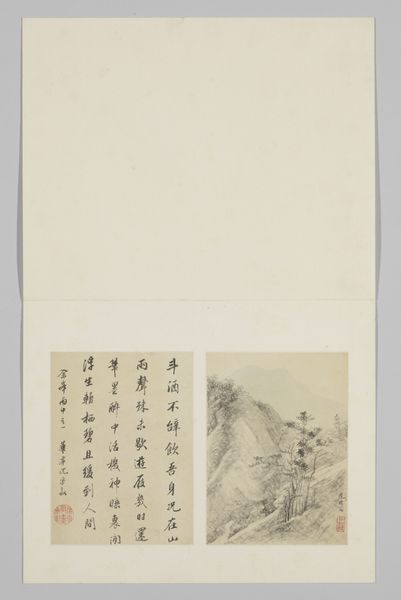 Curator: Let's turn our attention to this double album leaf, titled "Albumblad," crafted with mixed media, ink, and paper. While we cannot pinpoint the exact year, we know it originates somewhere between 1600 and 1800. The artist's name is Che Yizai. Editor: Well, my first impression is…understated elegance. It feels very tranquil, like a half-remembered dream, almost monochromatic with the pale ink. The composition in two parts—landscape on the right and calligraphy on the left—is unexpected, kind of daring, don't you think? Curator: Indeed. This composition embodies the classical integration of art forms—visually through the landscape and intellectually via the calligraphy. The landscape section evokes Taoist principles. Water signifies fluidity and change, while mountains stand for stability and the path to enlightenment. Notice the architecture almost dissolving into the mists, indicating human connection to nature and a balance between the two. Editor: Ooh, yes, and there is something incredibly moving about the figures tucked into that built environment against that landscape; it almost feels precarious, like their homes are emerging from the stone itself, built of dreams and echoes. Then you have the other half in contrast: the crisp calligraphy which feels to me, like the structure that binds everything together; a reflection upon reflection perhaps? Curator: Precisely. The calligraphy amplifies these themes through a literary lens. Each character is meticulously rendered, demonstrating reverence for tradition while also carrying symbolic weight within its content. It grounds the emotional response elicited by the dream-like landscape on the other half of the leaf. Editor: A very structured dream— I love it. And, the interplay of these seemingly opposite expressions actually amplifies my appreciation for each, for their intrinsic natures but also for how seamlessly they complement each other, even depend upon it. Curator: I couldn't agree more. It offers a window into a world where scholarship and artistry weren't disparate pursuits but complementary facets of a well-rounded individual. It brings us into contact with the artist's complete vision, literally. Editor: The landscape lets us breathe, the calligraphy asks us to reflect—it's really the perfect duet, in perfect harmony, really. I think it makes me wish my thoughts would all crystallize with this much grace!