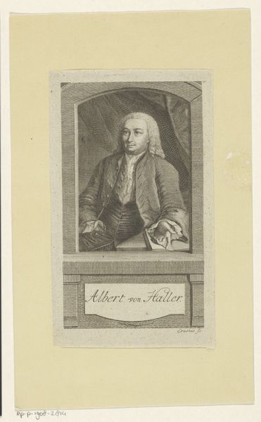 Gottlieb Leberecht Crusius created this print, "Portret van Albrecht von Haller," sometime in the 18th century using etching. Crusius, a German artist, worked during a period of significant social and political change, as Enlightenment ideals began to challenge traditional hierarchies. This portrait depicts Albrecht von Haller, a Swiss anatomist and physiologist. During the Enlightenment, scientific and philosophical discourse became increasingly influential, and Haller was a key figure in the scientific revolution, which emphasized empirical observation and reason. Representations like this served to immortalize and celebrate those figures deemed important. The artist's choice to portray Haller through the precise, detailed medium of etching reflects the Enlightenment's emphasis on clarity and rationality. In rendering Haller with such meticulous detail, Crusius underscores the importance of individuality and achievement, aligning with the period’s evolving notions of identity and meritocracy. The artwork captures a sense of intellectual authority, reflective of the societal values placed on scientific advancement.