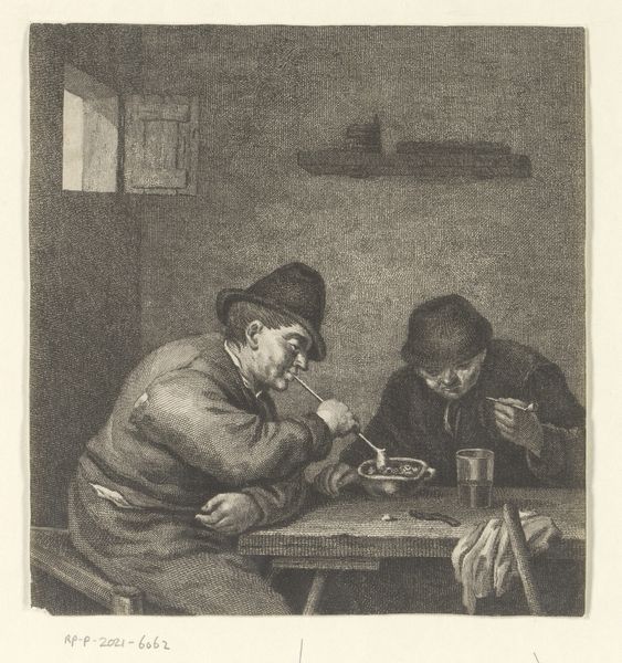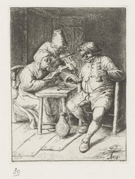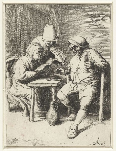 Adriaen van Ostade made this etching, "Singing Couples and Violin," in the Netherlands during the 17th century. It offers a glimpse into the social life of the Dutch Golden Age. Notice the figures gathered around a table, engrossed in music and drink. Such scenes were popular, reflecting a culture where leisure and communal activities were increasingly valued. But Ostade’s image isn't just a neutral depiction. The setting, likely a tavern, hints at a complex web of social interactions, class distinctions, and moral attitudes towards entertainment. The Dutch Republic was also a place of growing merchant power, one that led to a new kind of market for art. Artists responded to these changes by catering to the tastes of a broader audience. To truly understand this work, we need to delve into the historical context: examining Dutch social customs, musical traditions, and the role of taverns in community life. Art historical research provides that lens, revealing how seemingly simple scenes reflect deeper cultural values and social dynamics.