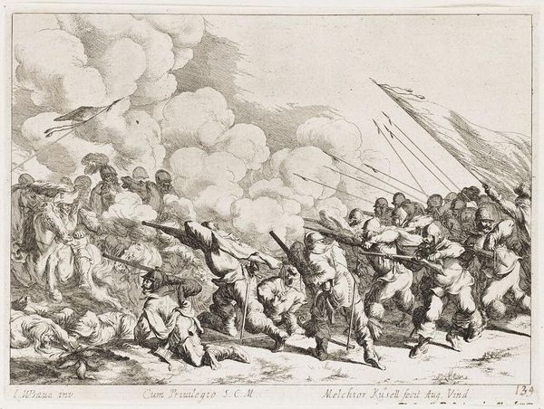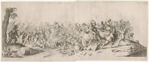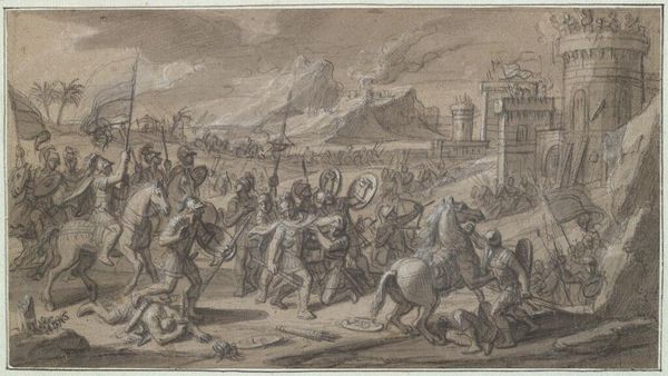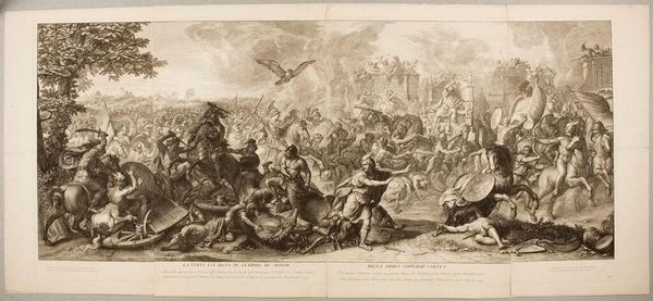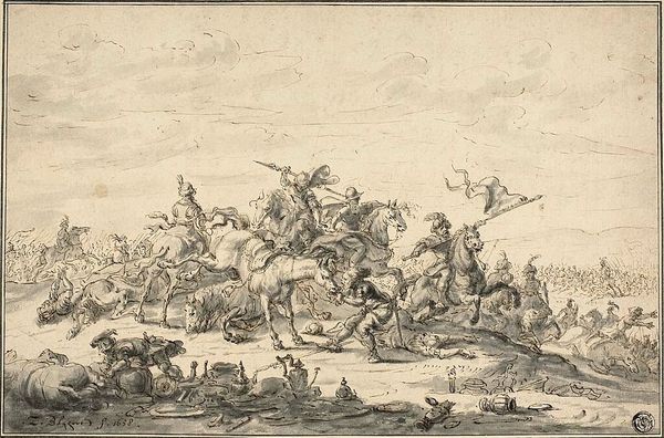Editor: This intense scene, "Battle between Russian and Tatar Cavalry" by Alexander Orlowski, plunges us into chaos. What symbols of power and conflict do you see embedded within this struggle? Curator: The fallen figures, both human and animal, create a powerful visual echo. Notice how Orlowski uses the rearing horses, weapons, and clothing to distinguish Russian and Tatar identities. Do you think these emblems contribute to a sense of cultural memory? Editor: It's interesting how clothing functions as shorthand for cultural identity here. It does feel like more than just a battle scene; it's about the clash of civilizations. Curator: Precisely. The artist uses established visual codes to evoke pre-existing narratives about these cultures, reinforcing, or perhaps even challenging, those narratives through the drama of combat. A potent visual shorthand for historical tensions. Editor: I see the power of those symbols now. Thank you. Curator: Indeed, the emotional and cultural weight of such images resonates even today, inviting us to contemplate how history is remembered and represented.