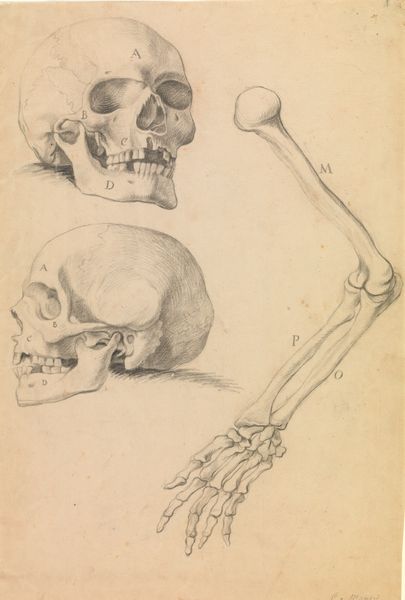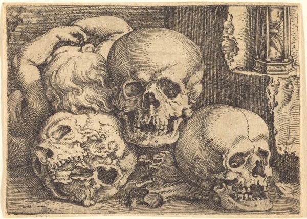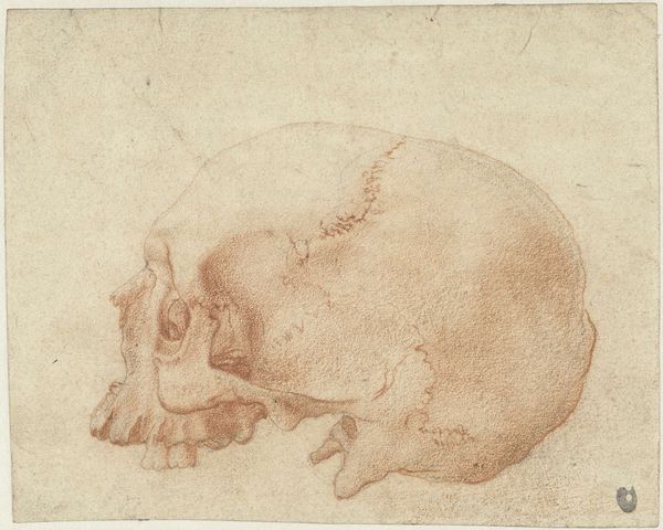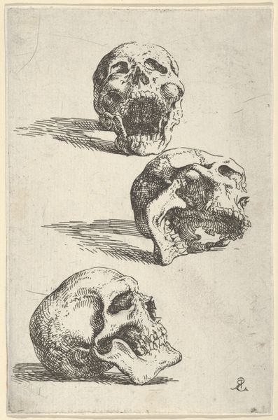 Curator: Wenceslaus Hollar's 1651 engraving, “Sectioned skull in profile to left with the left side of the cranium removed,” presents a stark yet meticulously detailed anatomical study. Editor: Oof, that’s…visceral. There's something inherently unsettling about seeing the inside of a skull so plainly. The light etches every groove, and you can't help but feel a touch of melancholy and maybe a little scared by our mortality. Curator: Precisely. Hollar’s work exemplifies the scientific interest characteristic of the 17th century, where empirical observation and detailed rendering became central to understanding the natural world. The cross-hatching technique is employed with great precision. Editor: But beyond the science, there's this almost…ghostly beauty? The delicate lines somehow capture the fragility of life itself. The starkness makes it strangely meditative; what was, is no longer. And it provokes thoughts on the architecture of our being, what forms this very "me-ness." Curator: Consider the interplay of line and form. The exterior contours of the skull are sharply defined, while the interior reveals a complex landscape of bone structure. It is an intellectualized "memento mori" presented during an era of shifting paradigms of both art and scientific investigation. Editor: That "memento mori" aspect really hits home. The hollowness of it…a vacant chamber where thoughts, dreams, memories once danced about. Now just empty space shaped by intricate bony supports and structural frameworks! It invites reflection and provokes pondering: where has this skull traveled; what were its perspectives when still animated and full? Curator: It reminds us of structure—of inherent human constraints but with possibilities. Through this intaglio, we come to grips with the structure of self; a cold object teaches about vital beings. Editor: Indeed! It pushes the viewer towards introspection; the cold exterior gives way toward contemplation about existence while also bringing the inevitability we can only observe thus far with distance and intrigue.