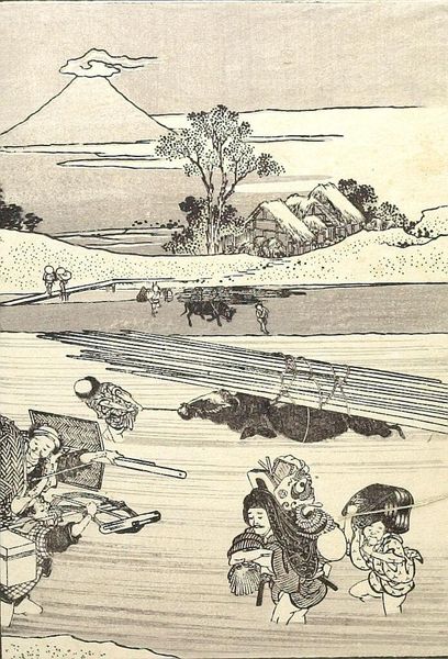 Editor: This is "Fuji the Day After Snow" by Hokusai, a woodblock print. It's fascinating how the artist used such minimal lines to convey depth and form, especially with the snow. What compositional elements stand out to you in this piece? Curator: Note the composition. The monochromatic palette reduces the scene to essential forms. The negative space of Fuji dominates the upper register. How does this emptiness affect our interpretation of the active human figure in the foreground? Editor: It definitely makes him seem smaller, almost insignificant against the backdrop of nature's grandeur. Curator: Precisely. The contrast isn't merely visual; it's philosophical. The artist uses spatial tension to communicate power dynamics. Editor: I see. Focusing on form clarifies the message. Curator: Indeed, it highlights how the artist utilizes composition to guide our understanding.
