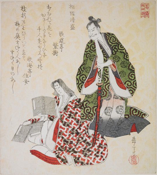 Curator: Yashima Gakutei, active in the early 19th century, created this print, "Taira no Koremochi, from the series Twenty-Four Generals for the Katsushika Circle." It's a woodblock print on paper, small but striking. Editor: It feels like a secret encounter. The woman's veiled, the man's offering something...a drink? There's a dreamy, otherworldly quality. Curator: This work references a famous Noh play, Momijigari. Koremochi, a warrior, encounters a beautiful woman who is actually a mountain witch in disguise. The print is steeped in the aesthetics of desire, illusion, and hidden identities. Editor: I love the patterning. The fan motifs on the man's robe, the blossoms on the woman's cloak—it's a visual feast. Is it a commentary on how appearances can deceive? Curator: Precisely. The print engages with complex themes of gender and power, illustrating the dangers lurking beneath seductive surfaces and societal expectations. Editor: It’s much darker than it appears at first glance. I think I’ll remember this one.