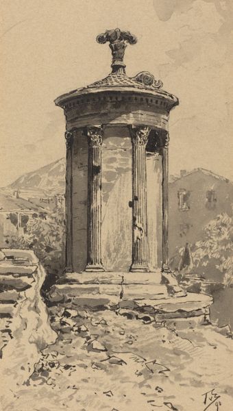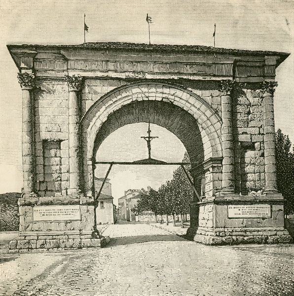 Curator: This pencil drawing by Giuseppe Barberis, made around 1890, is titled "Arco Di Cesare Augusto a Susa," which translates to the Arch of Caesar Augustus in Susa. My immediate impression is its delicate stillness, capturing this ancient arch against the backdrop of, what seems like, daily Italian life. What do you first notice? Editor: The sheer contrast! This imposing Roman monument dominating a contemporary cityscape sparks tension between the glory of a bygone empire and the quiet persistence of a modern town. The detailed pencil strokes render this intersection of historical eras quite striking. Curator: Absolutely. It serves as a powerful symbol, a constant reminder of the past woven into the present. I’m drawn to how Barberis uses pencil to depict not only the Arch itself, down to every stone, but also to evoke the texture of the mountains in the distance. How do you feel this artwork connects to art history and the Neoclassical movement? Editor: In the context of art history, this piece offers an excellent example of how Neoclassicism intersects with cultural preservation. We can observe the rise of conservation efforts in the late 19th century that are visually expressed through detailed documentation and admiration for classical forms. Curator: Precisely, and the Roman arch stands tall because it embodies this specific time of power. These monumental arches symbolized the height of imperial authority, visually solidifying Rome's cultural and military dominance. Its continued existence today serves as a powerful artifact and cultural artifact. Editor: Looking closer, I'm captivated by how the architectural details and inscription atop the arch serve a political purpose as well, announcing the emperor's accomplishments and reinforcing the empire’s narrative through its iconography. The drawing's accuracy echoes this function and elevates the Roman architecture into a permanent status within collective memory. Curator: Yes, that deliberate and very visual method to express this permanence, which remains potent even in Barberis’s more contemporary portrayal. This visual act of memorialization invites us to consider our present connections with past powers. What I feel, after a close observation, is a form of admiration by Barberis towards the ancient work. Editor: For me, reflecting on Barberis’ work offers a lens into how societies negotiate the complexities of honoring historical achievements while adapting to current circumstances, asking vital questions of what gets preserved, and most importantly, why.