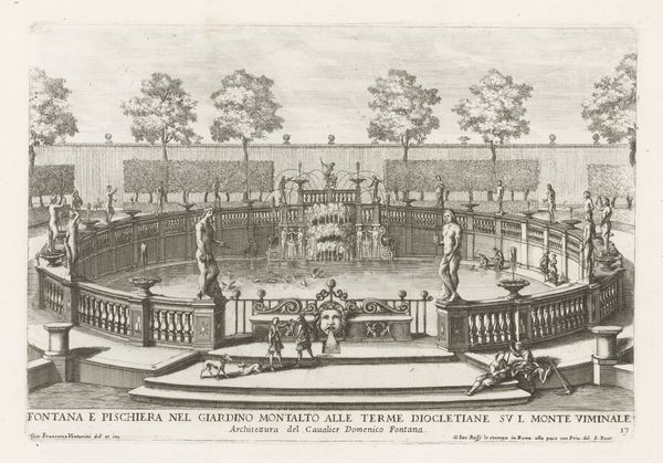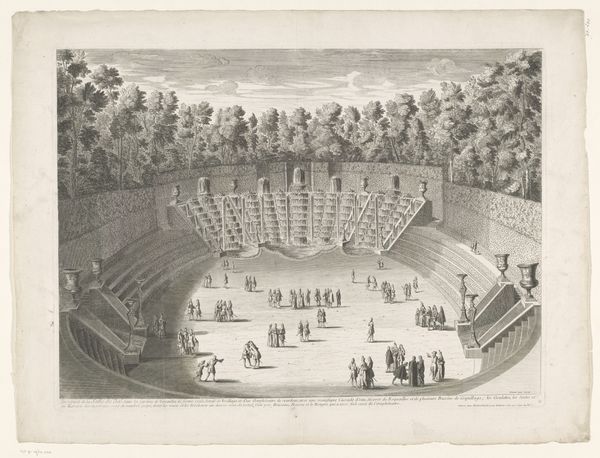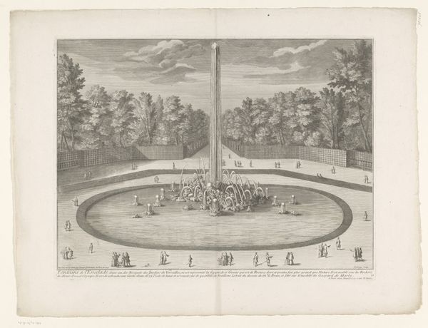 Curator: Quiryn Fonbonne created "Het koninklijke eiland in de tuin van Versailles," or "The Royal Island in the Gardens of Versailles," around 1715. It’s rendered as a print using etching and engraving techniques, and we have it here in the Rijksmuseum's collection. Editor: Immediately, I'm struck by the meticulousness. The rigorous geometric layout feels almost unsettling in its artificiality, a manufactured nature. All those lines and perfect right angles, the severe symmetry... It’s visually quite severe, isn't it? Curator: Absolutely. What’s interesting from a material perspective is considering how this idealized view served the Bourbon monarchy. The print wasn't just a decorative object; it was a tool in projecting absolute power and control over both nature and society through controlled garden spaces. The labour required to construct such environments also showcases this command. Editor: That’s fascinating context. On a formal level, observe the contrasting textures—the feathery trees against the smooth reflecting pool, the tiny figures dotting the pathways to give scale. The printmaker used etching and engraving masterfully to delineate the planes and capture light. Curator: And consider the social dimension: Versailles was essentially a stage for royal spectacle. The print then became a mass-produced version, accessible to a wider audience, propagating the image of royal magnificence, turning architecture and landscape into symbols of state power for consumption. Editor: True. Notice how the composition draws your eye towards the distant treeline. Fonbonne uses perspective to create a sense of depth, though the shallowness of the island's design undercuts any feeling of genuine immersion. It’s meant to be seen, surveyed. It almost acts as propaganda. Curator: Propaganda, yes. More than just artistic ingenuity; it’s an object deeply embedded in the political and social structures of its time. Understanding the processes behind its making helps unveil this historical reality, illustrating the entanglement of art, labor, and social dominance. Editor: I agree. Examining Fonbonne’s image and the visual techniques gives us tools for unlocking broader cultural understandings, whether intended or not. Curator: A good demonstration of how focusing on the social context helps in decoding an object that seems simple but represents powerful systems of representation. Editor: Indeed, a detailed consideration offers a richer and deeper understanding than just taking it at face value.