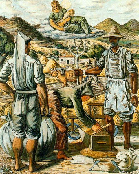 Antonio Berni created this painting called ‘Jujuy’ with oil paint, and I think it's interesting how he’s pushing a muted palette right up against bright reds and yellows, creating a striking contrast. The application of the paint is quite smooth, almost blended in places, but then you see these small details, like the lines describing the folds of the poncho, or the tiny white marks suggesting a woven texture. These marks feel precise, carefully considered. I think about all the decisions that go into painting - should I blend this edge, or leave it rough? Should I build up the color gradually, or go straight in with a bold stroke? Each choice changes how we experience the work. Look at how those vertical brushstrokes pull your eye up into the mountains behind them. I love how Berni lets the paint do its thing. ‘Jujuy’ reminds me a little of Diego Rivera’s social realism, in that it gives a beautiful insight into everyday life. But Berni has his own way of seeing the world. He invites us to look closer, and to appreciate the richness and complexity of the human experience.