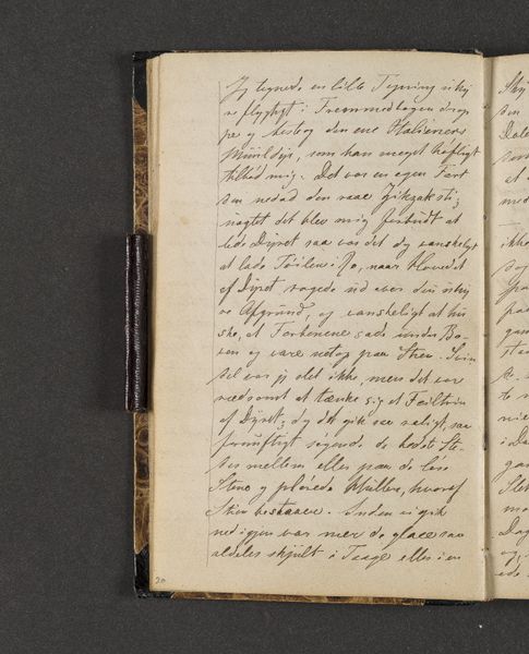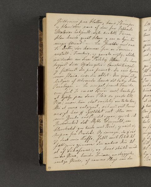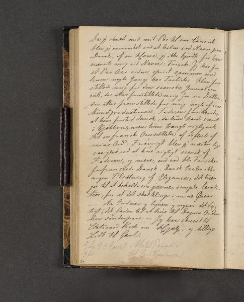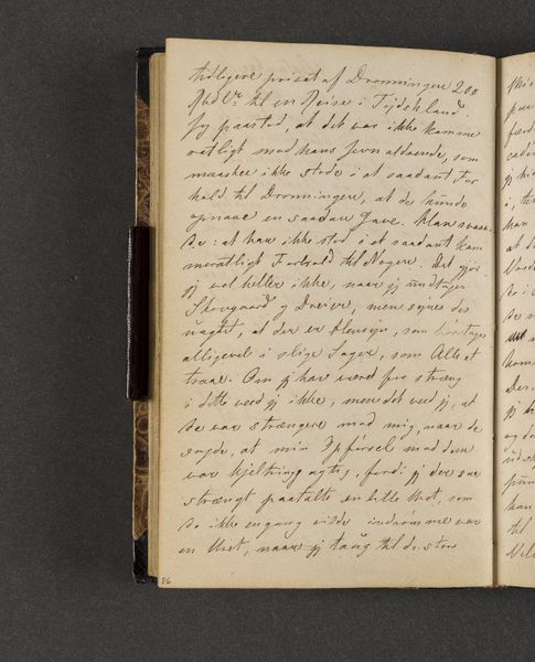 Curator: Examining this page, one sees the inherent structure dictated by the artist's hand, specifically in the deployment of ink across the textured paper. Note the deliberate arrangement of the script and the consistency in line weight, as well as the visual rhythm in the script that conveys more than just narrative information. Editor: Right! This is a page from Johan Thomas Lundbye’s "Rejsedagbog" or Travel Journal from 1845. It's made with ink on paper. I find it striking how intimate the journal feels. I mean, what is the emotional subtext generated by such visible craftsmanship? Curator: Interesting question. What are your impressions? Editor: Well, beyond the immediately graspable meaning, how the writing guides our eyes down the page, is there anything deeper that this arrangement implies? Is it purely structural, or could it offer insight into Lundbye's artistic practice? Curator: The script functions almost as a self-contained abstract expression, it fills the compositional space of the page. The visual qualities, and not legibility are more apparent, foregrounding Lundbye's sensibility. Consider how each character occupies its own micro-space, collectively contributing to a balanced visual field, while the linearity offers an additional, formal constraint. Editor: I see. I initially read it for the content, not for its artistic construction. Thanks for offering this fresh lens to approach this beautiful, material object! Curator: Precisely. Observing in this manner, the distinction between functional journal and artwork starts to blur.