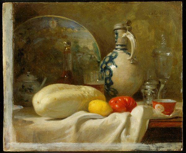 Editor: Here we have "Still Life with Ewer, Vessels and Pomegranate," a shimmering oil painting created around 1645 by Willem Kalf. Looking at it, I am struck by its opulence, like stumbling upon a pirate's treasure hoard in a dimly lit room. What do you see in this arrangement? Curator: You’ve touched on its core, truly. It's a tableau of abundance, isn’t it? Kalf’s Dutch Golden Age still lifes aren’t just about showing off wealth, though. See how the light dances on that ornate ewer, practically vibrating with energy? The painting speaks to the transient nature of earthly possessions; a gentle reminder, perhaps, of mortality. Those gleaming objects won't last forever, will they? Just like the opened pomegranate hints at fleeting pleasure and abundance. Editor: That’s a more somber read than I initially gathered. Does the meticulous detail contribute to that sense of transience? Curator: Absolutely. Kalf was a master of texture. Look closely - you can almost feel the cool smoothness of the silver tray, or taste the tartness of that lemon. It’s a kind of hyper-realism intended to draw you into a meditative space, contemplating the richness and impermanence of life. Editor: So it is trying to say more than just pretty things are nice to have. Fascinating. Curator: Exactly. The play of light, the arrangement of objects…it's all a carefully constructed stage for contemplation. It reminds me a little of Vanitas tradition but approached with this painter's exquisite understanding of color. Editor: I came in thinking pirates' gold, but I am leaving with mortality and tart lemons. Curator: That’s the joy of art, isn’t it? Changing perspectives, altering assumptions...and sometimes offering the unexpected taste of truth.