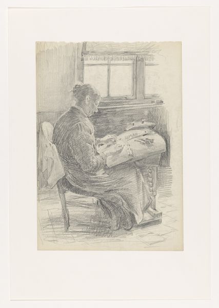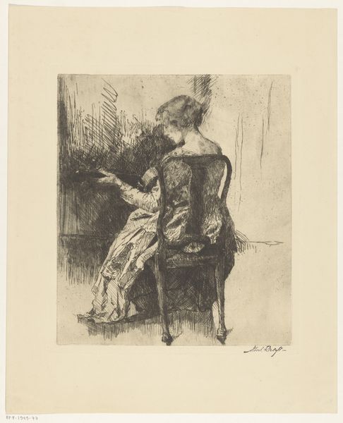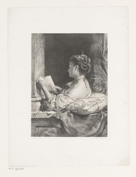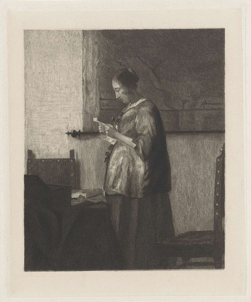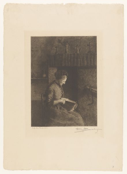 Editor: So, here we have "Lezende vrouw aan een tafel" or "Reading Woman at a Table" by Leo Van Aken, likely created sometime between 1867 and 1904, it seems to be done with etching. The shading creates such an intimate feel, and the woman seems completely engrossed in her book, a quiet and cozy scene. What strikes you when you look at this? Curator: It’s funny, isn’t it, how a simple scene can evoke such strong feelings. I think it's the everyday quality, this window into a private moment. Look at the composition: the contrast between the light falling on the book and the shadowed corners of the room. Makes me think of old photographs, capturing stolen moments. How does that quiet mood sit with you? Do you get a sense of the story she’s reading, perhaps influencing the artwork's feel? Editor: That's a wonderful way to think about it, a conversation between the viewer, the woman, and the unseen narrative she is engaging. Curator: Exactly. It invites us into a circle of shared imagination. Now, look at the technique: the lines are delicate yet so expressive, almost like a whispered confidence. Do you feel that informality clashes or enhances the classical style? Editor: That's interesting because even though it reminds me of older art styles like academic art or even old engravings, I'm intrigued by the subtle "realism" element! Curator: I think that realism sits on our contemporary reading. At that time that scene might be loaded with class and political connotations: think about it. Is she wealthy and educated, reading for pleasure, or maybe seeking knowledge and agency? What sort of person might hang such a work in their parlor? And what might be a reason? So many untold stories in just a simple piece. Editor: Oh, that adds another layer completely! So, it's not just a woman reading; it’s about what that act represents. I am walking away seeing so much more.