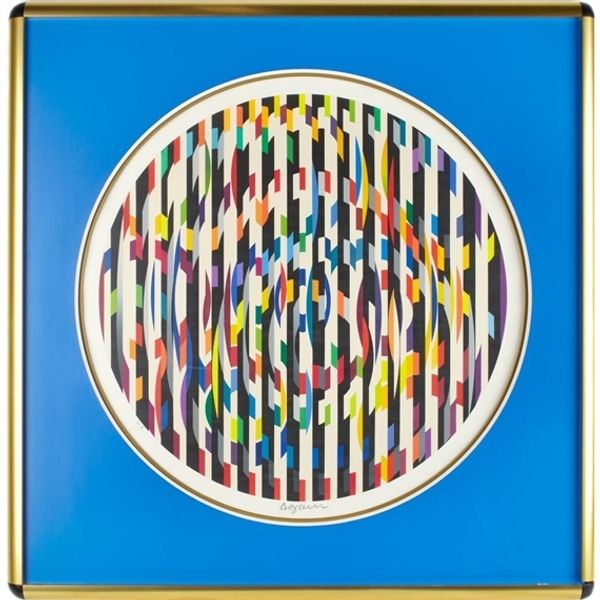 Yaacov Agam’s ‘Cele Carnival’ is a vibrant example of kinetic art, dazzling with its array of colours and dynamic composition. At first glance, one is struck by the interplay of vertical lines and fragmented circular shapes. The bright palette, composed of segmented blocks of primary and secondary colours, gives the work an immediate sense of joy and energy. Agam, deeply influenced by constructivism and a desire to go beyond the static nature of traditional art, creates a piece that invites movement and change. The composition is structured around vertical bands and concentric shapes, yet these elements are disrupted by the fragmentation and colour variations, destabilising any fixed perspective. This piece reflects Agam’s interest in time and perception, challenging the viewer to engage actively with the artwork. The fragmented nature encourages multiple interpretations and reflects the artist's belief that art should not be a passive experience. The artist opens up a discourse about the role of perception in constructing meaning.