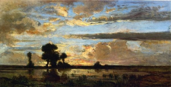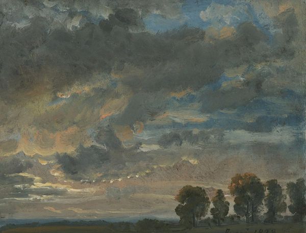 Editor: This is John Constable's "Extensive Landscape with Grey Clouds," painted around 1821, using oil on paper. I’m struck by how much of the composition is devoted to the sky; it feels incredibly dominant, almost overwhelming. What can you tell me about this piece? Curator: What interests me most here is the directness of Constable's engagement with his environment. This is a *plein-air* study, meaning it was made outdoors, a fairly radical approach at the time. How do the material conditions, being out in the elements, affect his painting? Editor: I hadn't thought of that. I guess working outside, he would be at the mercy of changing light and weather. Would that change how quickly he would need to work with the materials? Curator: Precisely. Consider the thick application of paint – the impasto. It wasn’t just about representing a scene; it was about capturing the fleeting atmospheric effects with available materials under time constraints dictated by nature. What is the cultural significance of choosing oil paints in particular? Editor: Well, I suppose oil paint afforded the opportunity to rework areas for a longer time and allowed him to get those subtle color gradations, it provided the freedom to really nail down the essence of the skies in a way that may not be afforded with something like water colors, especially when needing to make artistic choices in an uncontrolled outdoor setting? Curator: Exactly. Oil paint allowed Constable to manipulate the material in response to the constantly changing landscape. What's particularly compelling is how he elevates what would have traditionally been seen as a sketch into a finished work. We can begin to reconsider the hierarchical relationship between “high art” made in the studio, and “low art” that involves manual labor, to create art directly from observing labor, in this case in nature. Editor: That’s a great point. So, it's not just about what's depicted, but how and where it was made and from what available resources. It changes my whole perspective on Constable’s landscapes. Curator: It truly is a glimpse into the artist's process, emphasizing the tangible connection between the artwork and its environment.