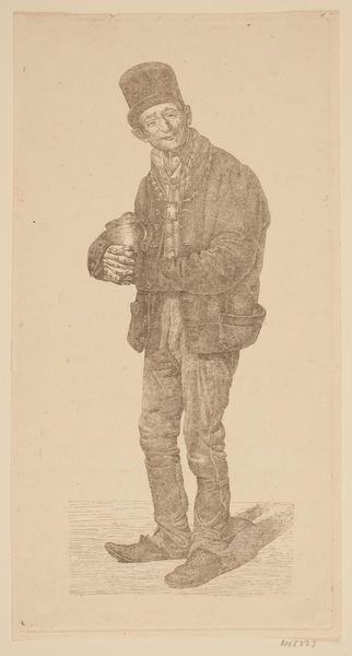Editor: Ernst Meyer's "Finessen-Seppl," created in 1822, is a striking engraving. The level of detail he achieved with the printmaking is fascinating, from the old man’s weathered face to the texture of his clothes. How should we approach interpreting a work like this from a material perspective? Curator: Let’s look beyond just the image itself and delve into its production. Engraving, as a process, requires specialized tools and skill. The matrix itself, often metal, dictated certain possibilities and limitations for Meyer. How do you think the choice of engraving as a medium impacts the content of the work? Editor: Well, engravings, especially in the 19th century, were often used for mass reproduction, making art more accessible. Does that democratizing aspect change how we view this image of what seems to be a common man? Curator: Precisely. The materiality pushes us to consider accessibility and consumption. "Fine arts" prints like these blurred the line between artistic expression and commercial production, raising questions about who art was for and who had the resources to make and distribute it. What do you think was the intended audience? Editor: Based on the engraving technique, and its distribution potential, maybe not the high society typically associated with Romanticism, but a more middle-class audience seeking relatable, genre-based imagery? Curator: Exactly! The print material, and the engraving process itself, speak volumes about shifting social structures, economics, and the evolving role of art and the artist in society during the Romantic period. It’s not just about *what* is depicted, but *how* and *for whom* it was made. Editor: That’s fascinating. I hadn’t thought about the way the material itself influences the message of a piece. Curator: Focusing on material and production makes us realize this artwork’s cultural value beyond aesthetics. It shows us art’s deep connection to industry and society.