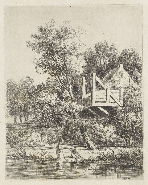 Editor: This etching, "Landschap met waterleiding" or "Landscape with water pipe", is by Reinierus Albertus Ludovicus baron van Isendoorn à Blois and was made sometime between 1796 and 1856. The landscape feels quiet and a little melancholic. What do you see in this piece? Curator: I am immediately drawn to the architectural elements – the water pipe, of course, but also the house-like structure it seems to feed. They speak to me of human intervention in nature. There's a delicate balance, isn't there? We see technology being inserted into an otherwise pastoral scene. Do you find this placement jarring? Editor: Not jarring exactly, but it does feel a bit like the technology is imposing on nature. Is there any cultural context that speaks to this dynamic? Curator: Certainly. Remember this was during the early stages of the Industrial Revolution, a time of enormous shifts in humanity's relationship with the natural world. Water, of course, has always been symbolic - cleansing, life-giving - but now it's being harnessed in new and powerful ways. This image suggests both promise and potential discord. The way the landscape cradles the building and the pipes speaks to a gentler view, but the pipes also obstruct views in the landscape. Editor: So the artist is showing both the advantages and disadvantages of using technology within the landscape. Are the trees meant to mean something too? Curator: Yes, note the different types of trees used. The evergreens pointing up to the sky could symbolize an aspiration to some eternal truth or paradise, in contrast to the human constructs within the artwork. Do you think that reinforces the relationship between humans and nature that we discussed? Editor: Definitely! I hadn’t thought about it that way, but that makes perfect sense. Curator: It's fascinating how such a seemingly simple scene can hold so much cultural memory, don’t you think? It's like the landscape itself is a stage for this ongoing drama.