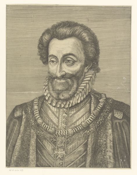 This is Hendrick Goltzius’s portrait of King Henry IV of France, an engraving which captures the king in a moment of poised authority. The composition centers on the king's upper body, framed by an elaborate ruff, regal fur mantle, and heavy chain, all rendered with meticulous detail. The textures are palpable; from the softness of the fur to the intricate folds of the ruff, Goltzius masterfully uses line and shadow. The king's gaze is direct. His presence is heightened by the contrast between the ornate attire and the subtle, almost human expression on his face. This contrast invites us to consider how power is constructed through representation. Goltzius uses the semiotic language of clothing and ornamentation to convey status, but the king's expression hints at a more complex, perhaps even vulnerable, individual. Consider the frame, or rather the absence of one, and how it challenges the notion of fixed meanings. Goltzius’s portrait destabilizes established meanings as it invites ongoing interpretation.