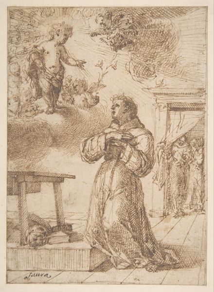Editor: We’re looking at "The Kneeling Hermit Facing Right" by Andries Both. It’s an etching, and something about the stark lines and the subject matter… it just feels incredibly somber to me. Almost theatrical. What do you see in this piece? Curator: Somber is a brilliant starting point! This lone figure, etched with such starkness... it almost feels like eavesdropping on a private moment of introspection, doesn’t it? See how Both uses the landscape--those gnarled branches mirroring the lines on the hermit’s face--to amplify the emotional weight. What strikes me is how personal this feels. It's a quiet, lonely scene, perhaps reflecting the artist's own search for meaning. And the skull, subtly placed... it’s a meditation on mortality, right? Editor: Definitely! It also gives me that memento mori vibe. Was this a common theme back then? Curator: Precisely! This echoes the baroque obsession with mortality, a response to the turbulent times. But look closer—the hermit's gaze isn't necessarily one of despair. There's a calmness there, an acceptance. Tell me, what does the landscape itself suggest to you? Editor: Hmm, it feels kind of desolate, but also maybe peaceful? It's interesting how Both contrasts the busy detail around the hermit with the more simplified background. Curator: Yes, and that contrast pulls our gaze right back to the figure, back to that inner world. For me, this etching is not just about death, but about finding solace in contemplation amidst the inevitable. It's beautiful and melancholy, right? Editor: Absolutely! I think I came in expecting a more straightforward depiction of religious piety, but there's a complexity to it that makes it much more interesting. Curator: Isn't that the magic of art? Always defying our initial expectations! It has an emotive and reflective aspect, like the kneeling hermit searching for something, like we're all searching, somehow.