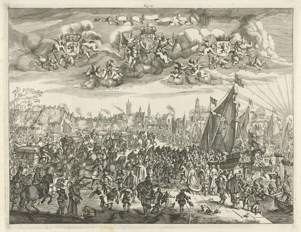 Curator: The scale here is astonishing. Even through the oil on canvas, the overwhelming atmosphere of military campaign just pours from this piece. Editor: Indeed. What you're responding to is Rubens' "Henry IV of France at the Siege of Amiens in 1597," created around 1630. Rubens captures a pivotal historical moment through a dramatic and imposing composition. We see both King Henry, amidst his military operations, and also gain a sweeping perspective of the city, its siege laid bare. Curator: Rubens wasn't simply creating an historical record, was he? It feels so embedded in the rhetoric of power, painting King Henry almost as a conquering hero. Are we really meant to uncritically celebrate military power? This piece was completed decades after the depicted event, at a time of different sensibilities about gender, nation, and war. How do those later attitudes impact the image's legacy? Editor: Well, Rubens's role as a court painter is undeniably at play here. The painting served a propagandistic function. The emphasis on Henry’s leadership was crucial for the monarchy's self-representation. These representations were vital tools used to shore up support and legitimize royal power, especially given the continuous political turbulence of the period. Think about how court painters like Rubens navigated complex power dynamics. Curator: Power, yes, and spectacle! Consider the viewer forced to stand at eye level with mounted troops, the king literally looking down upon them. Then juxtapose that controlled scene with the city view, spread across a landscape being torn apart by conflict. There is that stark juxtaposition. Where can dignity be found in such moments of crisis, especially when certain people had no chance but to stand on the sides while all their lives are destroyed? Editor: That very tension underscores a core debate around history painting: Can historical moments of trauma truly be aestheticized, and what ethical responsibility do artists bear when portraying subjects marked by inherent power imbalances? Curator: It leaves you wondering what perspectives are ignored, who has been actively left out of the narrative. Editor: It absolutely forces us to confront uncomfortable truths embedded in the stories we choose to tell.