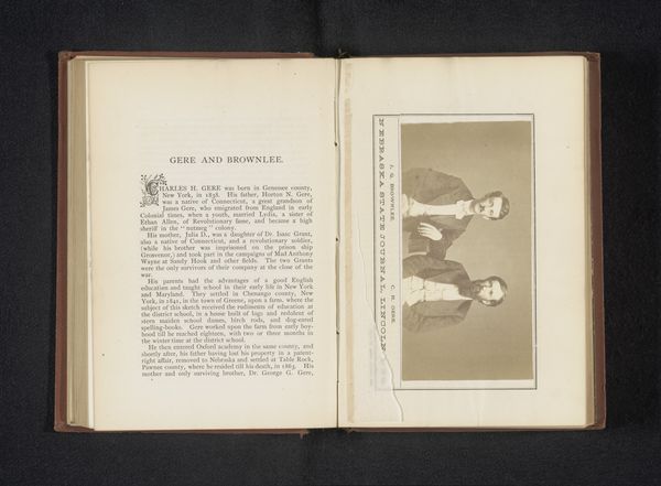Curator: Our point of focus: *Meisje met bloemen*, or Girl with Flowers, a photographic print by Frédéric Boissonnas, sometime before 1902. Its charm immediately strikes, yet the composition feels unusually placed within this bound book, doesn’t it? What are your initial observations? Editor: Well, I’m drawn to the textural contrast. You have this aged paper, full of text, then this small, soft portrait nestled within. It’s almost like a secret hidden within the academic text. What formal qualities stand out to you, framing your experience with the piece? Curator: The stark juxtaposition undeniably captures attention. Consider the deliberate staging of the image. Boissonnas carefully chose to represent his subject alongside what appears to be still-life, but the technical skill is in subtly manipulating light to define planes. How does the monochrome palette impact the interplay of form and shadow? Editor: I see what you mean. The grayscale definitely emphasizes shape, especially in the folds of her dress and the arrangement of flowers. It’s interesting how that limits our access too: it gives us form, but it does so while omitting any chance to see color. Does this relate at all to historical photographic practices or any specific formal choices by Boissonnas? Curator: Certainly. Early photographic processes, frequently rendered the world in monochrome or sepia tones. That being said, the deliberate emphasis on tonal gradations allows Boissonnas to focus on the subject. What’s your interpretation of the negative space around the subject? Editor: I see, well that limited tonal range directs my gaze entirely onto the girl and flowers. It keeps the image minimal, contained even. That makes sense, since she occupies only a fraction of the open book, further contributing to the feeling of peering in at an almost private, contemplative moment. Thank you, that clarifies my understanding! Curator: Precisely! It seems, looking at it now, to show an intentional disruption of scholarly rigidity by introducing soft lines that evoke intimate reflection. Something to sit with, I'd suggest.