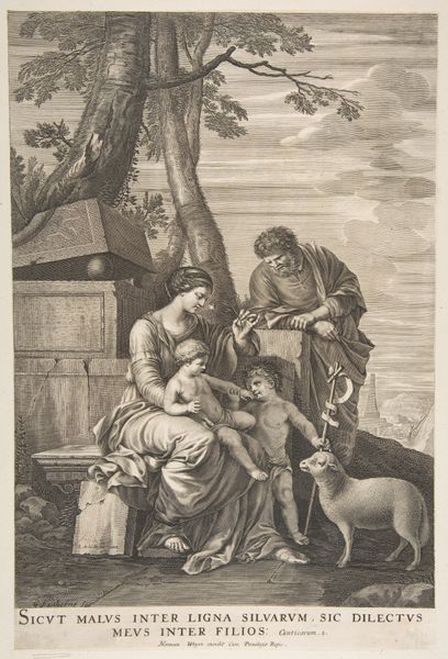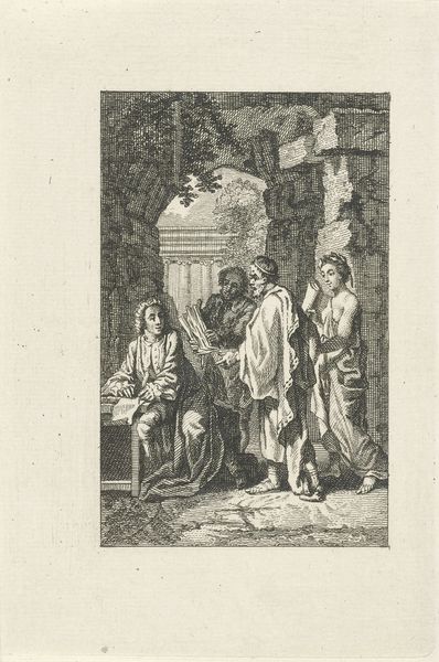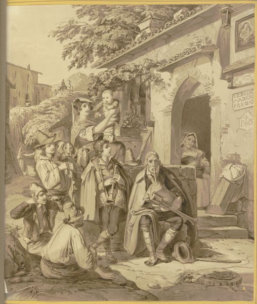 Curator: This is Giovanni Domenico Tiepolo's "Peasant Family at Table, from the Room of Rustic Scenes, in the Foresteria (Guesthouse)," created around 1757. It’s tempera on plaster. Editor: It feels incredibly intimate, despite the rather grand setting. Almost like we're catching a glimpse into a real, everyday scene of rustic life. I notice how the light softly envelops the figures. Curator: Exactly. The frescoes originally adorned the walls of the Tiepolo family’s guest house, where it represented a idealized vision of rural life intended for the enjoyment of the wealthy visitors, who never encountered a similar, hard version of a daily living. Editor: So it’s less about documenting the grit of peasant existence and more about curating a desirable lifestyle image? What kind of labor would go into making the pigments for a work of this scale? It’s fascinating to think about how much artisanal effort supports this…idealized leisure. Curator: Precisely. Tiepolo uses those rustic, picturesque scenes to create a sort of charming fiction for the aristocracy. And thinking about materials: tempera requires painstaking layering of pigment—each layer carefully considered. This underscores the inherent artificiality within the frescoes, reflecting the artist’s perspective, instead of some authentic, "objective" representation of the common folk. Editor: Yes, but within those idealized images, we can find insight of labor as well: that woman offering what seems to be food or small merchandise…The casual gestures speak volumes, the seated man with the hat seems worn out but is holding his infant… It shows work's effect. Even filtered through an aristocratic lens. Curator: Good point! It demonstrates how Tiepolo engaged with those visual tropes, using them as a conduit to touch on social issues, albeit gently, through genre painting in the Rococo style. Editor: For me, focusing on process opens another way to understand the social message—not just as a charming view of rustic life but rather it gives clues on the life in rural Italy at that time. Curator: By considering it, we realize this image provided those visitors some carefully crafted scenes of tranquility to appreciate… while most common people just sought their daily bread, in such ways! Editor: I find myself looking closer at the muted tones used on clothing; even wealth couldn't get one out of manual labor, so they probably weren't worried to dye those clothes very often... That's thought provoking!