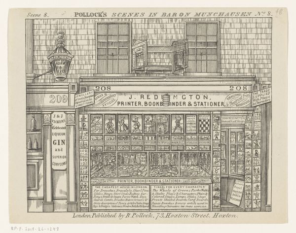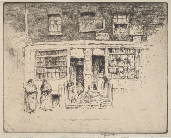 Editor: This print by Adolphe Martial Potémont, created in 1864, depicts the headquarters of the Société des Aquafortistes. I’m immediately struck by how this image captures a moment in Parisian life, with fashionable figures admiring artwork displayed in the windows. As a historian, how do you interpret the scene? Curator: It’s interesting to consider what the “Société des Aquafortistes” represented. It was essentially an artist-run organization that promoted etching as a fine art at a time when it was often considered a purely reproductive medium. Looking at this image, we see the society presenting itself to the public. Do you notice anything about *who* seems to be engaging with the art in the windows? Editor: Yes, there seems to be a certain class of people represented. They all appear well-dressed and affluent. Is this Society marketing artwork to an elite clientele? Curator: Precisely. Consider that this print itself would have circulated among a similar demographic. Images like this reinforced the idea of art as a commodity, available to those with the financial means and cultural capital to appreciate it. How might this affect the kind of art being produced? Editor: It possibly suggests that artwork may cater to the tastes and values of this specific societal group, reflecting their lifestyle. It’s interesting how this artwork becomes part of a social system. Curator: Exactly. It reveals the complex interplay between art, commerce, and social class in 19th-century Paris. Editor: So the artwork not only reflects the society of its time, but it reinforces that specific vision too. Thank you. That has been extremely helpful. Curator: Indeed. It prompts us to question whose stories are being told, and by whom. A vital reflection on the politics of imagery.