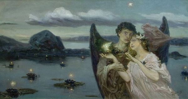 Editor: Here we have Hans Zatzka's oil painting, *Allegory of Sleep.* It feels like stepping into a dream, with the soft colors and ethereal figures. What do you see in this piece from a structural point of view? Curator: Immediately, I'm drawn to the composition. Note how Zatzka divides the canvas into distinct zones of activity. There is the clear horizontal division between the earthly realm of the sleeping figure and the celestial upper register, defined by diaphanous figures. These zones create a dynamic tension, wouldn't you agree? Editor: I do. It seems there is a clear dichotomy. Can you tell me more about that compositional aspect? Curator: The use of light reinforces this dichotomy. The warm, incandescent glow of the lamp on the right counteracts the cool, lunar light illuminating the ethereal figures. This interplay of light and shadow articulates space, adding a psychological dimension to the artwork. The brushstrokes too are key. Observe the loose, painterly application in contrast to the tight, meticulous details in certain areas, creating a fascinating visual texture. Editor: So, it's not just about what's depicted but how it's depicted. I hadn't considered that dichotomy you spoke of earlier. Curator: Precisely. The artist directs our eye strategically. Furthermore, note the chromatic scheme of pastel colours across the canvas to represent light and the unconscious. Editor: Fascinating. Now I'm seeing more of the careful considerations the artist made. Thanks so much! Curator: It's been a pleasure to explore how the interplay of formal elements shapes our perception of this 'dreamscape.'