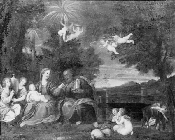 Nicolas Loir painted this small oil on canvas, “The Rest on the Flight into Egypt,” sometime in the mid-17th century. Loir was a French painter working in a period marked by religious conflict and the consolidation of royal power under Louis XIV. Here, we see Mary, Joseph, and the infant Jesus taking refuge during their flight from Herod's persecution, an intimate moment of respite amidst displacement. Mary nurses her child, her gaze reflecting a deep tenderness, while Joseph sits nearby, embodying the protective guardian. In this domestic scene, the artist draws from traditional representations of the Holy Family and subtly introduces a more human and relatable narrative. "The Rest on the Flight into Egypt" is a poignant depiction of love, protection, and vulnerability. It reminds us of the universal need for safety and security, especially resonant in times of turmoil.