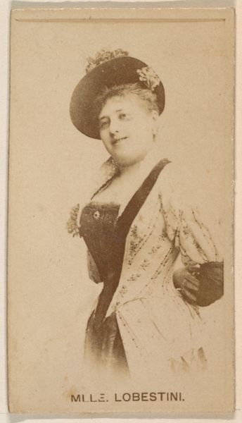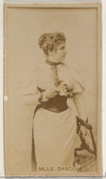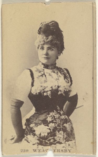 Editor: This is a photograph of Sarah Las-Gelles, taken sometime between 1890 and 1895 by W. Duke, Sons & Co., and printed using the albumen process as part of a cigarette card series. The texture and sepia tone give it a dreamy, antique feel. What strikes you when you look at it? Curator: For me, this image immediately prompts questions about the labor and materials involved. Consider the albumen process: eggs were literally beaten and used to create a glossy surface on which the image could adhere. It’s a material process intimately connected to domesticity, but here it is used for mass production. What does it mean to consume an image literally created with kitchen waste? Editor: That's fascinating. I hadn't considered the albumen print in that way. So, the everyday material transforms into something…glamorous, advertising cigarettes, no less. Curator: Exactly! And think about the lace in the photograph: its presence speaks of the time-consuming labor needed to produce such finery, worn to promote mass-produced cigarettes. There’s a distinct tension between the hand-crafted image and the industrial product it's meant to sell. How does this tension affect our viewing of Sarah Las-Gelles herself? Editor: It almost cheapens her image, but elevates cigarettes... by association? So, the materials used and how the portrait was circulated reflect larger socio-economic forces at play in the late 19th century. Curator: Precisely. We are dealing with representations and means of production and distribution, all pointing to larger issues of consumption, class, and visibility. It makes us question who is represented and what power structures made this portrait possible in the first place. Editor: I never thought of a simple photograph having so many layers relating to social and economic dynamics! Thank you. Curator: My pleasure. Looking at the material conditions challenges what we consider "high art" and draws attention to the labor inherent in every image.