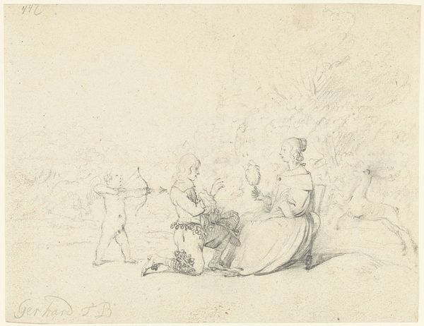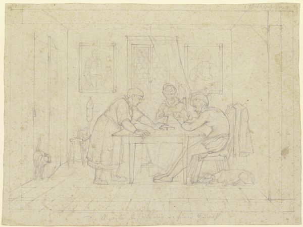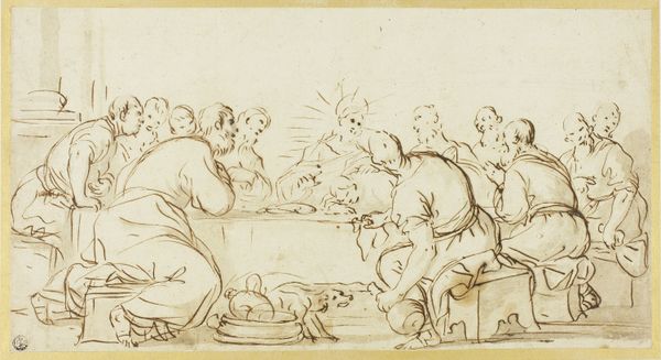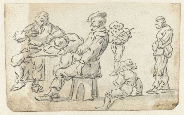 Editor: This is Marcellus Laroon the Younger's "Tavern Scene" from the Tate Collection. It's a quick sketch, really, but you get a sense of the boisterous atmosphere. What can you tell me about the social context of such a scene? Curator: It's a fascinating glimpse into 18th-century social life. Tavern scenes were popular, reflecting the rise of a commercial society where people gathered to socialize and conduct business. But consider: who had access to these spaces, and whose stories are often left untold? Editor: So, the tavern itself becomes a stage for societal dynamics? Curator: Precisely. Laroon gives us a peek into this world, but we must also critically examine whose perspective is being presented and how the politics of imagery might be at play. Editor: That's a great point; thanks for making me think about the public role of art. Curator: Indeed; considering whose story is being told shapes our view of history.