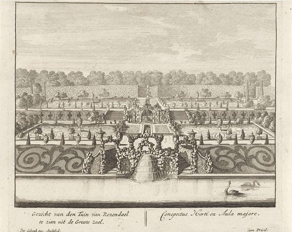 Romeyn de Hooghe created this engraving of a garden gallery and pond using etching and engraving techniques. Notice how the composition is structured by the architecture of the space, framing the scene and guiding our eye towards the vanishing point. The linear perspective gives depth to the garden, while the figures in the foreground create a sense of scale and invite us into the scene. The contrast between the geometric forms of the architecture and the organic shapes of the foliage adds visual interest and a sense of balance. The detailed rendering, achieved through the use of fine lines, brings texture and detail to the foliage. This garden design reflects a desire to impose order on nature, turning it into a constructed ideal. The garden then becomes a stage where social interactions and cultural displays take place. The formal qualities of the print allow us to understand the ideas behind the artwork and how it captures the cultural values of its time.