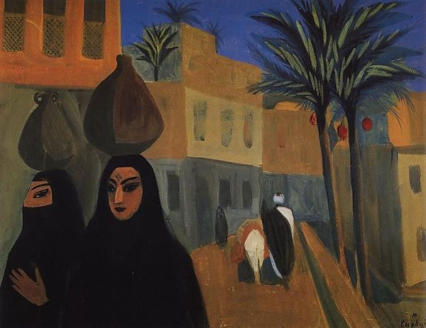 Iosif Iser painted Dobrujan Landscape with Five Turk Women using oil paints. The colors are quite vibrant, with warm hues of orange, yellow, and red contrasting with the cool blues of the sky, and the dark hues of the women's garments. Oil paint, traditionally used for fine art, allows for a richness of color and depth, which Iser exploits to great effect. The brushstrokes appear quite loose, and the paint application is quite thick in some areas. You can almost feel the texture of the paint on the canvas. Iser's choice of materials and techniques elevates his work beyond a simple depiction of a scene, and creates something evocative and expressive. It shows the artist's skilled engagement with the history of painting, while also engaging with the representation of a specific cultural and geographical context. Through the materiality of oil paint, the artist gives dignity and presence to the subjects of the painting. This piece reminds us that any work of art can be better understood when we look at the how, what, and why of its making.