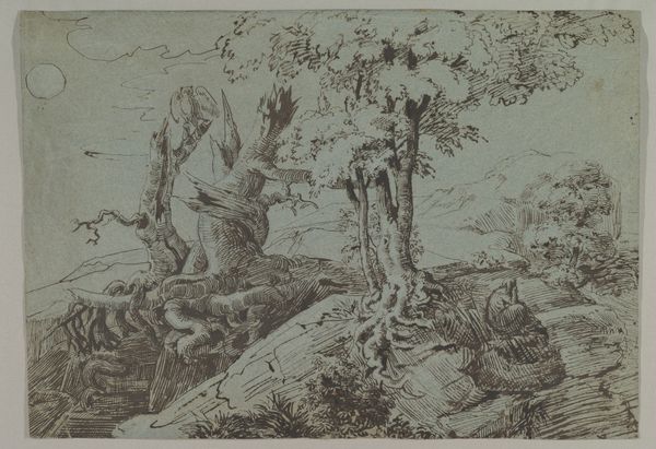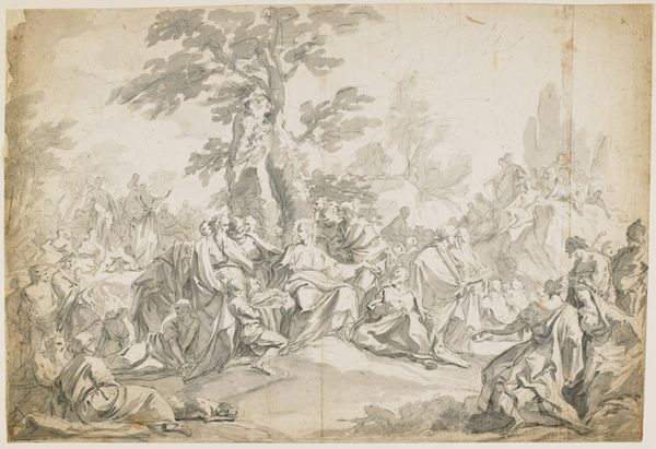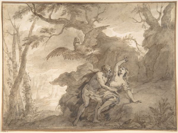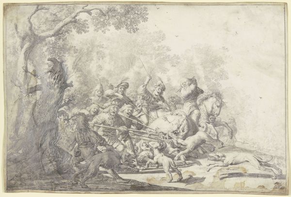 Pietro Testa created this print, Venus giving arms to Aeneas, using etching techniques. The density of fine lines form a complex, almost dreamlike scene, drawing us into a world where classical mythology intertwines with naturalistic details. Observe how the composition unfolds—a diagonal thrust from the lower right towards the upper left, anchored by the figures of Venus and Aeneas. This arrangement structures the narrative, guiding our eye through a progression of forms, from the vulnerable figure on the ground to the goddess offering divine assistance. The linear quality of the etching emphasizes contour and texture, creating a rich surface that invites close inspection. But these lines do more than just describe; they construct a visual language, a semiotic system of signs. The crispness of Aeneas’s armor contrasts with the soft, flowing lines that define Venus, marking a distinction between mortal and divine realms. The dense, dark area on the lower left challenges the concept of linear perspective, creating a sense of depth but also of spatial ambiguity. This interplay between clarity and obscurity is not accidental. It serves to destabilize our reading, reminding us that art is a place of shifting meanings rather than fixed interpretations.