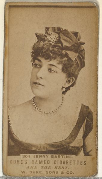 Editor: Here we have a portrait of Alma Stewart Stanley, created by W. Duke, Sons & Co. in the 1880s. It's a card, originally used to promote Duke Cigarettes, and made with albumen-print. It has an appealing vintage aesthetic and gives the impression of luxury because of the attire of the actress. What do you see when you look at it? Curator: Well, what immediately grabs me is not the *art* per se, but the means of its distribution: a cigarette card. It speaks volumes about the late 19th-century's burgeoning consumer culture and how even art became commodified. Think about the laborers involved in tobacco production, the printing processes for these cards – albumen-print photographs mass-produced and given away as a marketing ploy. This challenges our typical understanding of "high art". What sort of message do you think the production implies? Editor: That it makes art affordable? So almost…disposable, in a way? Something consumed like the cigarettes themselves, without a lot of consideration for its value? Curator: Exactly. The materiality of the object – a flimsy piece of card stock designed to be discarded with the cigarette packaging – reveals its true function. The artistry is secondary to its purpose as advertisement, inextricably linked to consumption and the economics of pleasure. And it served to create a need that never existed until then. This blurring of boundaries is important when discussing art, labor, materiality, and how social dynamics of power dictate these processes. Editor: That makes so much sense! So it is both a promotional product *and* a portrait, inextricably linked to consumerism. The actress may also have endorsed Duke Cigarettes? Curator: Precisely. Considering that Alma Stewart Stanley was, likely, hired for that promotional reason; do you believe there are social connotations involved? Editor: The commercial angle certainly reframes how I see it. I suppose it makes me think differently about art and labor, shifting from artistry to product. Thanks for pointing that out!