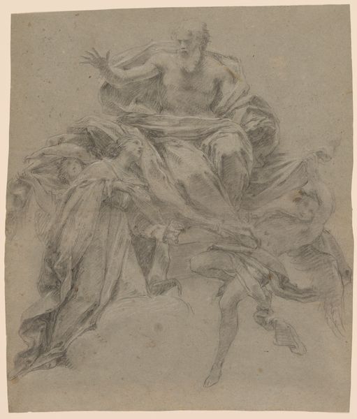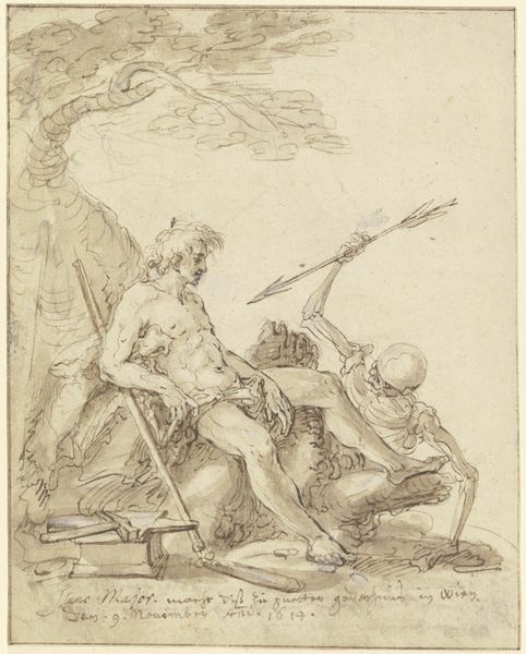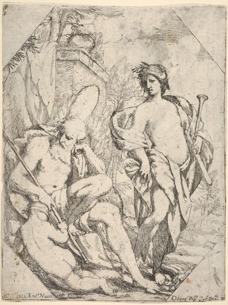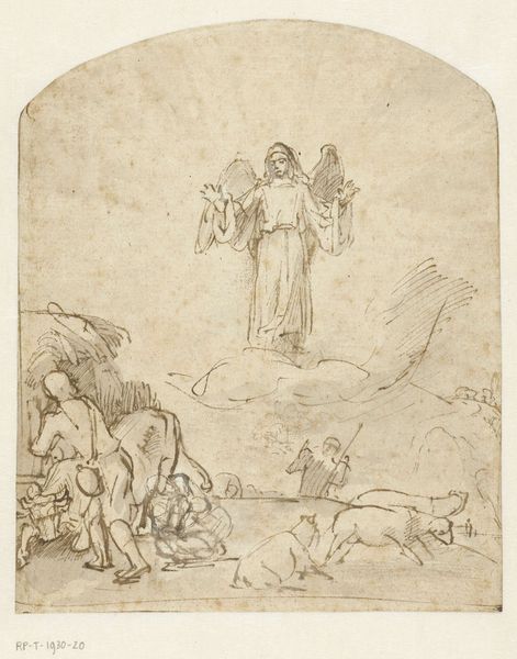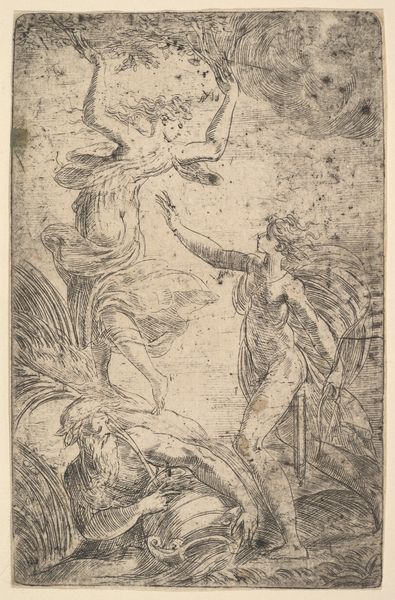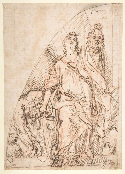 Editor: We are looking at "Two Women with Sun and Bird" an ink drawing made circa 1500-1600 by an anonymous artist. The recto side seems to depict allegorical figures and a bird. What compositional elements strike you most? Curator: Immediately, I’m drawn to the strategic placement of figures within the pictorial space. Note the verticality of the standing woman contrasted against the reclining figure and the bird situated low, near the base. Observe, too, the dramatic lighting emanating from what appears to be a sun figure. What effect does this strategic arrangement create? Editor: It does make for a striking contrast. The standing woman almost seems to be reaching for the sun. The reclining figure and the bird seem more earthbound. Do you think this choice of verticality has to do with establishing a visual hierarchy? Curator: Precisely. The use of verticality immediately establishes the dominant and subordinate relationships, doesn't it? Furthermore, the contrast in poses adds to the dynamic tension. What inferences can you draw from this tension? Editor: The tension really speaks to me of striving or maybe aspiration, with the standing woman wanting something more than what she already has. Curator: That's an astute reading. Consider the artist’s use of line as well –– the swift, almost frenetic strokes contribute to the sense of urgency and movement. Line is here more than just a delimiter of form. How does line dictate the mood and emotional weight of the composition? Editor: The linework really does lend a raw and expressive feel. I'm intrigued by the artist's calculated mark-making. Now I’m curious about how the verso ties into this visual scheme. Curator: Exploring the verso is a worthwhile undertaking, a way to examine this artist's mind. This drawing demonstrates that even simple sketches are a manifestation of formal decisions, loaded with potential meanings. Editor: Thanks, I have much to ponder!