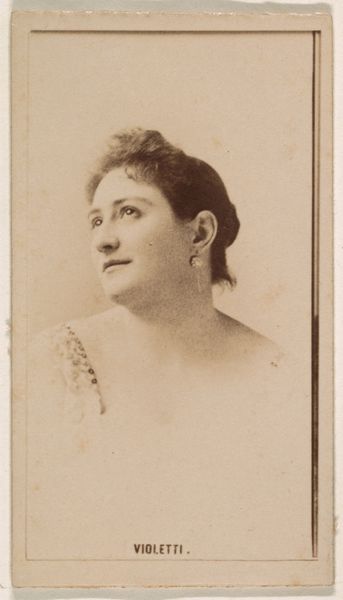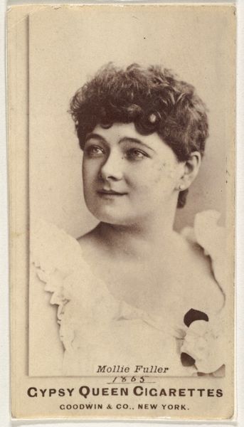 Curator: Here we have a photographic print from 1890: “Miss Parry, from the Actresses series (N245) issued by Kinney Brothers to promote Sweet Caporal Cigarettes." It's currently housed here at the Metropolitan Museum of Art. Editor: Oh, she’s got such a delicate, wistful expression, gazing off into some beautiful unknown future. It feels like a dream fading at the edges. Curator: Absolutely, and part of that dreamy effect might be from the photogravure printing process, which gives it a soft, almost ethereal quality. The Kinney Brothers were leveraging new technologies to appeal to a wider consumer base, and cards like these were a collectible craze, tucked into cigarette packs. Editor: Ah, right, so it’s about accessibility then, right? Subverting high art to engage the everyday smoker, binding art and consumerism, performance and labor... Were people offended? It all sounds quite subversive, really. Curator: There’s definitely that element of subversion there, certainly a commentary about labor—as women entered the public sphere through performance, industry was happy to package their image to move product. What I also appreciate is that in some small way these portraits were democratizing representation. Miss Parry, whatever her story, is suddenly infinitely reproducible, held in countless hands across the country. It’s the genesis of mass culture, and I am always looking to what those original sparks ignited! Editor: It also underscores, for me, the constant act of creating value: imbuing these actresses, the cigarettes, with the sheen of culture, elegance… And the ephemerality! Everything—image, product, fame—eventually fades. The card's discoloration adds to that sense of fading. Curator: Yes, absolutely! Time leaves its mark, and reminds us to ponder on that strange, seductive allure of transient beauty. These tangible imprints become silent witnesses, urging reflection on the relationship between industry, image, and desire.