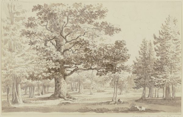 Pieter Gerardus van Os created "Deer in a Forest" using pen in grey and brown ink, and brush in grey. The drawing presents a dense woodland scene with a clearing where deer rest. Notice the artist's detailed work with line and tone, creating depth and texture that invite the viewer into the forest. Van Os was part of a tradition that placed emphasis on direct observation and naturalistic representation. The composition uses the structure of the trees to frame the open space. The delicate use of light and shadow adds a sense of atmosphere, making the forest feel both inviting and mysterious. The careful arrangement of elements creates a balanced yet dynamic composition that highlights the harmony between the animals and their environment. How does the artist’s formal arrangement affect our understanding of nature's order?