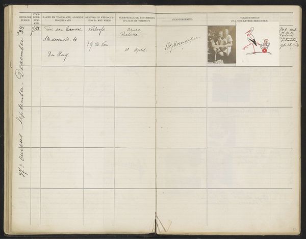 Curator: Here we have a page, specifically Blad 101, from a register, "Stamboek van de leerlingen der Koloniale School voor Meisjes en Vrouwen te 's-Gravenhage deel II (1930-1949)." It seems to date from between 1937 and 1939. It’s a fascinating object rendered with pen and ink on paper, incorporating photography as well. Editor: Wow, this hits me right in the melancholy. That faded paper, the handwritten entries, and those tiny vintage photographs... it all speaks of a time so distant yet somehow still present. It's like looking at ghosts captured on the page. Curator: Yes, these documents carry immense cultural memory. Each handwritten entry, meticulously recorded, tells a story of individual aspirations within a specific colonial context. Even the hand-drawn typeface contributes to a sense of formality and the significance of record-keeping. Editor: Those two small photos are intriguing, aren’t they? One woman holds a child, maybe about to depart. The other shows a man seemingly isolated by his work in this unnamed place. It's almost as if those stark contrasts, juxtaposed within this administrative document, reveal layers of unseen lives. Curator: Absolutely. Consider the symbolic weight of the images: A mother with her child embodies continuity, perhaps suggesting a hopeful future for a life uprooted; the man with his labor, maybe alludes to obligation or survival through occupation of resources from this place? These were powerful images associated with their place, both physical and psychological. Editor: So what do you suppose this register holds about cultural exchange? Was it really for colonial interests alone, or can you see a sense of humanity, perhaps hidden within the rows and dates, of how the students viewed it themselves? I almost wonder what some doodles or other additions not on the official roster might imply? Curator: Precisely, and what could be more evocative than the power of paper? We find hand-drawn typeface, photographs, portraiture… everything conspires to place individual histories within the frame of larger social and cultural narratives, yet leave you questioning the entire premise of the document itself! Editor: This makes me want to grab my own sketchbook, filled with memories of the day. Looking through their records somehow creates empathy. It invites me to re-evaluate my connection to history, like finding an old map and dreaming of the place it points towards.