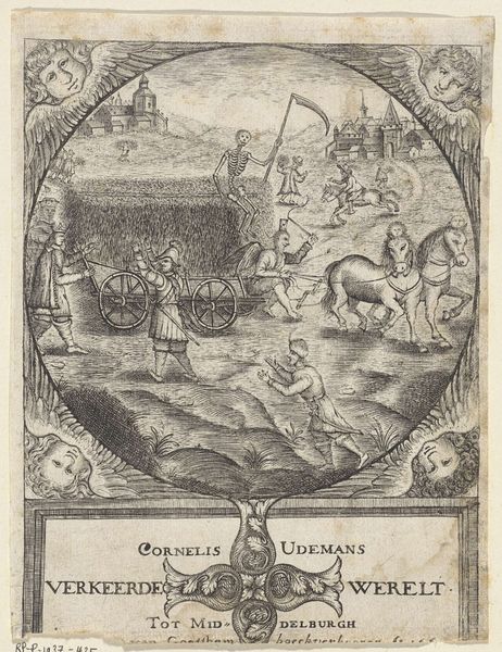 Editor: Here we have Hendrik Elandt's engraving, the title page for "De Veldgezangen van Thyrsis", from 1702. I find the composition quite striking, the way it is framed by what appears to be a stage curtain. What do you make of this elaborate visual arrangement? Curator: Indeed. The framing you observe initiates a compelling interplay between interiority and exteriority. The Baroque aesthetic here emphasizes ornamentation and grandeur. Note how the artist employs diagonal lines of composition, creating dynamism across the image, and drawing the viewer's eye through various planes of action, almost as if deconstructing theatrical staging. Editor: Can you elaborate on those planes of action? I am especially intrigued by the characters depicted in the various layers of this artwork. Curator: Certainly. At the apex, winged cherubs guide a chariot through a sky, contrasted by a classical tableau featuring satyrs and nymphs cavorting on what we can call the middle plane, and framing them all, notice that two other sets of figures function structurally to delineate upper from lower. Tell me, where does your eye go first, and where does it travel? Editor: I'm initially drawn to the inscription at the bottom, and then my gaze drifts upward towards the figures in the clouds, so maybe there’s a deliberate narrative arc in the composition? I never thought to consider this image in terms of contrasting planes! Curator: Precisely. This is a demonstration of how even an engraving intended as a title page can function as an elaborate and nuanced work of art. Editor: It definitely gives me a new appreciation for the artistry involved.