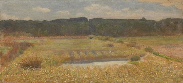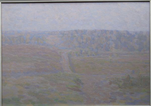 Curator: Welcome. We are standing before "Maasik," an oil painting crafted between 1908 and 1910 by the Estonian artist Konrad Mägi. Mägi was pivotal in introducing modernist influences to Estonian art, largely working within the realms of post-impressionism and expressionism. Editor: It evokes a quiet sort of melancholy, doesn't it? A landscape of muted tones layered in bands – ochre fields giving way to emerald hills and hazy blue forests. The sky itself feels like it's holding its breath. Curator: Absolutely. And in Mägi's Estonian context, the work’s atmospheric perspective, heavy with muted tones and earthy colours, resonates with the nation’s cultural mood in the early 20th century. Estonian national identity was gaining force; artistic representation played a role in creating the spirit. Editor: And there's a striking juxtaposition between the cultivated, ordered field in the foreground and the wild, almost impenetrable forest in the distance. That opposition highlights how society both interacts with and contrasts against the landscape. Were those ordered fields even accessible to most? Curator: That tension, I think, encapsulates a larger anxiety about modernity and its encroachment on traditional ways of life, on agricultural landscapes, at the time. While there's little social realism evident in most landscapes, the act of representation implies questions of land ownership and power dynamics. Editor: Which leads us to question, doesn't it, who benefited from these meticulously rendered fields? And who might have felt displaced by this push for 'progress' or agrarian order that inevitably disrupts ecosystems. The artist lived from 1878-1925 during considerable industrial transformation. I do wonder, in this context, how much of what appears to be tranquility in the painting veils much deeper conflict. Curator: Those are interesting interpretations for understanding it today. And the expressionist influence cannot be discounted when considering Konrad Magi’s other symbolic pieces. What could "Maasik" suggest beyond the beautiful land itself? Editor: This image really speaks to the fact that art is so much more than simply aesthetics, isn’t it? It encourages questioning the circumstances that made the image both possible and meaningful. Curator: Yes, truly seeing requires more than looking. It’s about comprehending what histories and contexts imbue each brushstroke, shape, and shade.